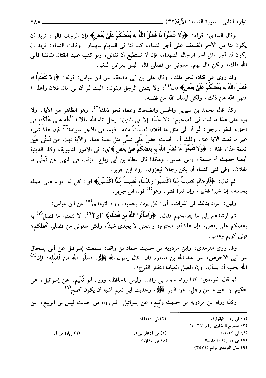 وَكَذَا قَالَ مُحَمَّدُ بْنُ سِيرِينَ وَالْحَسَنُ وَالضَّحَّاكُ وَعَطَاءٌ نَحْوَ ذَلِكَ (2) وَهُوَ الظَّاهِرُ مِنَ الْآيَةِ وَلَا يَرِدُ عَلَى هَذَا مَا ثَبَتَ فِي الصَّحِيحِ: "لَا حَسَد إِلَّا فِي اثْنَتَيْنِ: رَجُلٌ آتَاهُ اللَّهُ مَالًا فسَلَّطَه عَلَى هَلَكَتِهِ فِي الْحَقِّ، فَيَقُولُ رَجُلٌ: لَوْ أَنَّ لِي مِثْلَ مَا لِفُلَانٍ لعَمِلْتُ مِثْلَهُ. فَهُمَا فِي الْأَجْرِ سَوَاءٌ" (3) فَإِنَّ هَذَا شَيْءٌ غَيْرُ مَا نَهَتِ الْآيَةُ عَنْهُ، وَذَلِكَ أَنَّ الْحَدِيثَ حَضَّ عَلَى تَمَنِّي مِثْلَ نِعْمَةِ هَذَا، وَالْآيَةُ نَهَتْ عَنْ تَمَنِّي عَيْنَ نِعْمَةِ هَذَا، فَقَالَ: {وَلا تَتَمَنَّوْا مَا فَضَّلَ اللَّهُ بِهِ بَعْضَكُمْ عَلَى بَعْضٍ} أَيْ: فِي الْأُمُورِ الدُّنْيَوِيَّةِ، وَكَذَا الدِّينِيَّةِ أَيْضًا لِحَدِيثِ أُمِّ سَلَمَةَ، وَابْنِ عَبَّاسٍ. وَهَكَذَا قَالَ عَطَاءُ بْنُ أَبِي رَبَاحٍ: نَزَلَتْ فِي النَّهْيِ عَنْ تَمَنِّي مَا لِفُلَانٍ، وَفِي تَمَنِّي النِّسَاءِ أَنْ يَكُنَّ رِجَالًا فَيَغْزُونَ. رَوَاهُ ابْنُ جَرِيرٍ.