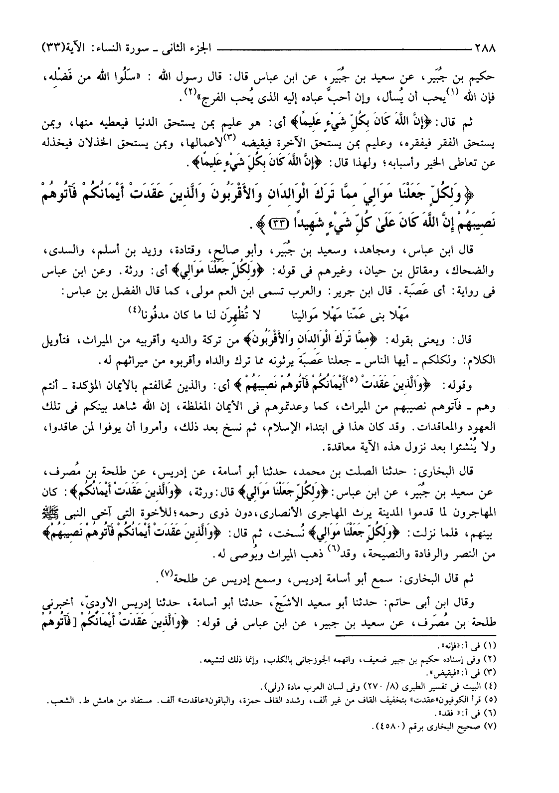 قَالَ الْبُخَارِيُّ: حَدَّثَنَا الصَّلْتُ بْنُ مُحَمَّدٍ، حَدَّثَنَا أَبُو أُسَامَةَ، عَنْ إِدْرِيسَ، عَنْ طَلْحَةَ بْنِ مُصَرِّفٍ، عَنْ سَعِيدِ بْنِ جُبَيْرٍ، عَنِ ابْنِ عَبَّاسٍ: {وَلِكُلٍّ جَعَلْنَا مَوَالِيَ} قَالَ: وَرَثَةً، {وَالَّذِينَ عَقَدَتْ أَيْمَانُكُمْ} كَانَ الْمُهَاجِرُونَ لَمَّا قَدِمُوا الْمَدِينَةَ يَرِثُ الْمُهَاجِرِيُّ الْأَنْصَارِيَّ، دُونَ ذَوِي رَحِمِهِ؛ لِلْأُخُوَّةِ الَّتِي آخَى النَّبِيُّ صَلَّى اللَّهُ عَلَيْهِ وَسَلَّمَ بَيْنَهُمْ، فَلَمَّا نَزَلَتْ {وَلِكُلٍّ جَعَلْنَا مَوَالِيَ} نُسخت، ثُمَّ قَالَ: {وَالَّذِينَ عَقَدَتْ أَيْمَانُكُمْ فَآتُوهُمْ نَصِيبَهُمْ} مِنَ النَّصْرِ وَالرِّفَادَةِ وَالنَّصِيحَةِ، وَقَدْ (6) ذَهَبَ الْمِيرَاثُ ويُوصي لَهُ.