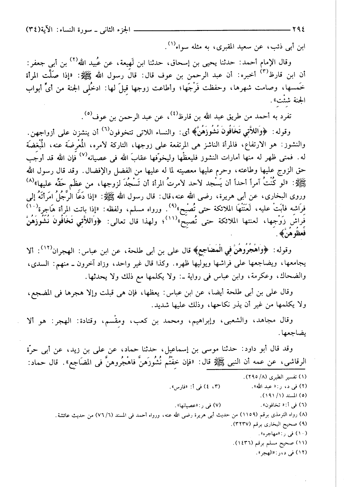 وَقَوْلُهُ تَعَالَى {وَاللاتِي تَخَافُونَ نُشُوزَهُنَّ} أَيْ: وَالنِّسَاءُ اللَّاتِي تَتَخَوَّفُونَ (6) أَنْ يَنْشُزْنَ عَلَى أَزْوَاجِهِنَّ. وَالنُّشُوزُ: هُوَ الِارْتِفَاعُ، فَالْمَرْأَةُ النَّاشِزُ هِيَ الْمُرْتَفِعَةُ عَلَى زَوْجِهَا، التَّارِكَةُ لِأَمْرِهِ، المُعْرِضَة عَنْهُ، المُبْغِضَة لَهُ. فَمَتَى ظَهَرَ لَهُ مِنْهَا أَمَارَاتُ النُّشُوزِ فليعظْها وَلْيُخَوِّفْهَا عقابَ اللَّهِ فِي عِصْيَانِهِ (7) فَإِنَّ اللَّهَ قَدْ أَوْجَبَ حَقَّ الزَّوْجِ عَلَيْهَا وَطَاعَتَهُ، وَحَرَّمَ عَلَيْهَا مَعْصِيَتَهُ لِمَا لَهُ عَلَيْهَا مِنَ الْفَضْلِ وَالْإِفْضَالِ. وَقَدْ قَالَ رَسُولُ اللَّهِ صَلَّى اللَّهُ عَلَيْهِ وَسَلَّمَ: "لَوْ كُنْتُ آمِرًا أَحَدًا أَنْ يَسْجد لِأَحَدٍ لأمرتُ الْمَرْأَةَ أَنْ تَسْجُدَ لِزَوْجِهَا، مِنْ عِظَم حَقِّه عَلَيْهَا" (8) وَرَوَى الْبُخَارِيُّ، عَنْ أَبِي هُرَيْرَةَ، رَضِيَ اللَّهُ عَنْهُ، قَالَ: قَالَ رَسُولُ اللَّهِ صَلَّى اللَّهُ عَلَيْهِ وَسَلَّمَ: "إِذَا دَعَا الرَّجُلُ امرَأتَهُ إِلَى فِرَاشِه فأبَتْ عَلَيْهِ، لَعَنَتْهَا الْمَلَائِكَةُ حَتَّى تُصْبِح" (9) وَرَوَاهُ مُسْلِمٌ، وَلَفْظُهُ: "إِذَا بَاتَتِ الْمَرْأَةُ هَاجرة (10) فِراش زَوْجِها، لَعْنَتْهَا الْمَلَائِكَةُ حَتَّى تُصبِح" (11) ؛ وَلِهَذَا قَالَ تَعَالَى: {وَاللاتِي تَخَافُونَ نُشُوزَهُنَّ فَعِظُوهُنَّ} .