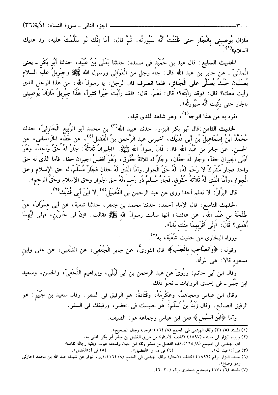 الْحَدِيثُ السَّابِعُ: قَالَ عَبْدُ بْنُ حُمَيْدٍ فِي مَسْنَدِهِ: حَدَّثَنَا يَعْلَى بْنُ عُبَيْد، حَدَّثَنَا أَبُو بَكْرٍ -يَعْنِي الْمدَنيّ-عَنْ جَابِرِ بْنِ عَبْدِ اللَّهِ قَالَ: جَاءَ رَجُلٌ مِنَ الْعَوَالِي وَرَسُولُ اللَّهِ صَلَّى اللَّهُ عَلَيْهِ وَسَلَّمَ وجِبْرِيلُ عَلَيْهِ السَّلَامُ يُصَلِّيانِ حَيْثُ يُصَلَّى عَلَى الْجَنائِز، فَلَمَّا انْصَرَفَ قَالَ الرَّجُلُ: يَا رسولَ اللَّهِ، مَنْ هَذَا الرَّجُلُ الَّذِي رَأَيْتُ مَعَكَ؟ قَالَ: "وَقَدْ رأيْتَه؟ " قَالَ: نَعَمْ. قَالَ: "لَقَدْ رأَيْتَ خَيْرًا كَثِيرًا، هَذَا جِبْرِيلُ مَا زَالَ يُوصِينِي بِالْجَارِ حَتَّى رُئِيت أَنَّه سَيُورثُه".