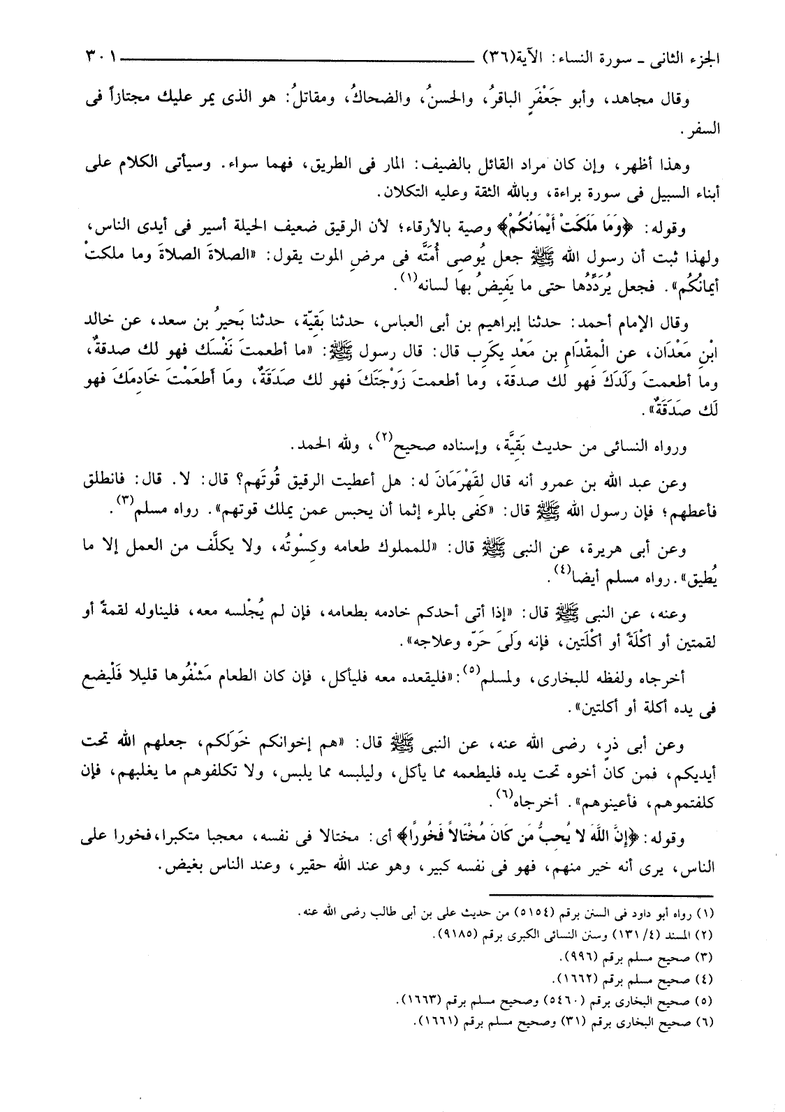 وَقَوْلُهُ: {وَمَا مَلَكَتْ أَيْمَانُكُمْ} وَصِيَّةٌ بِالْأَرِقَّاءِ؛ لِأَنَّ الرَّقِيقَ ضَعِيفُ الْحِيلَةِ أَسِيرٌ فِي أَيْدِي النَّاسِ، وَلِهَذَا ثَبَتَ أَنَّ رَسُولَ اللَّهِ صَلَّى اللَّهُ عَلَيْهِ وَسَلَّمَ جَعَلَ يُوصِي أُمَّتَه فِي مرضِ الْمَوْتِ يَقُولُ: "الصلاةَ الصلاةَ وَمَا ملكتْ أيمانُكُم". فَجَعَلَ يُرَدِّدُها حَتَّى مَا يَفِيضُ بِهَا لِسَانُهُ (1) .