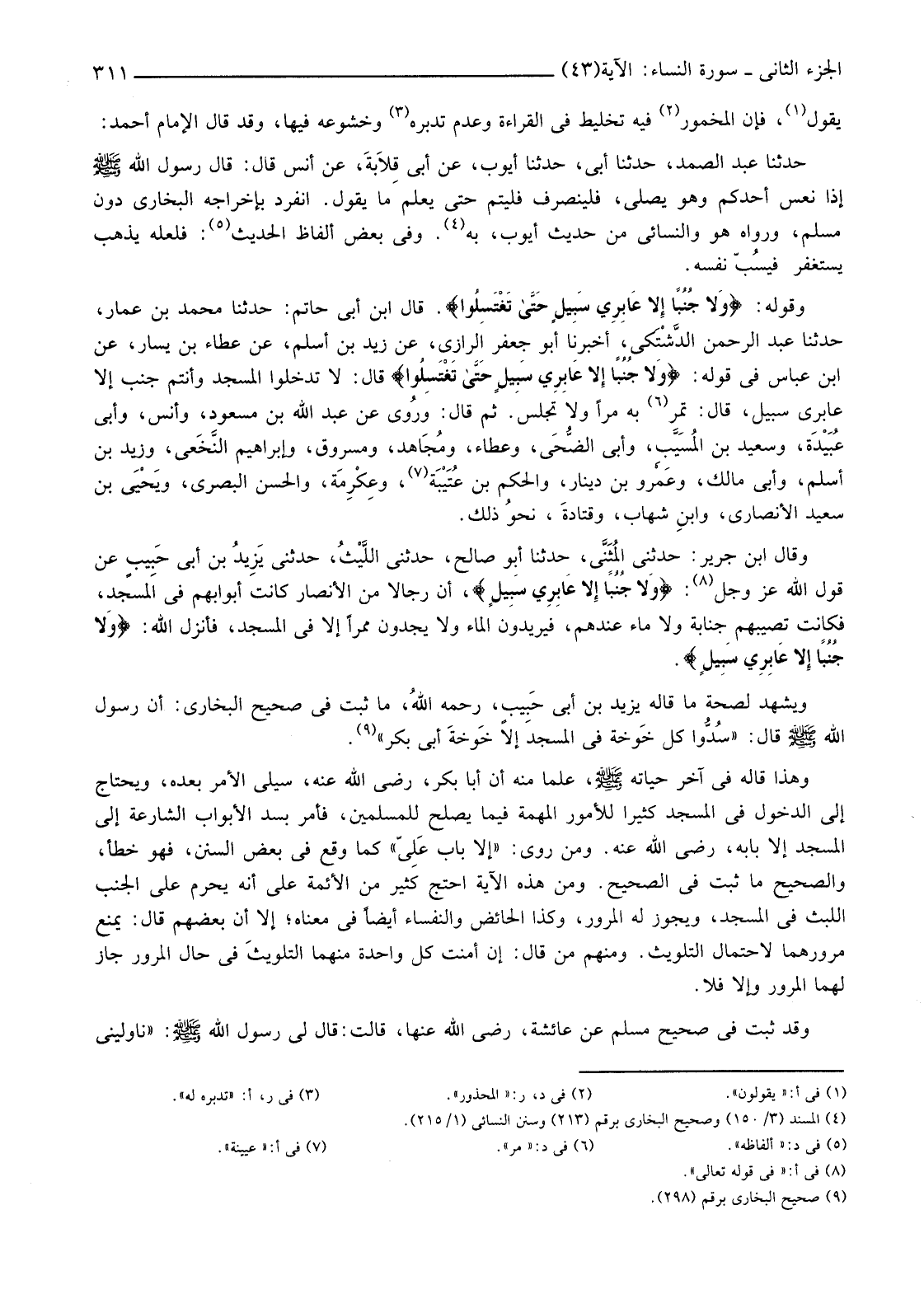 وَقَوْلُهُ: {وَلا جُنُبًا إِلا عَابِرِي سَبِيلٍ حَتَّى تَغْتَسِلُوا} قَالَ ابْنُ أَبِي حَاتِمٍ: حَدَّثَنَا مُحَمَّدُ بْنُ عَمَّارٍ، حَدَّثَنَا عَبْدُ الرَّحْمَنِ الدَّشْتَكي، أَخْبَرَنَا أَبُو جَعْفَرٍ الرَّازِيُّ عَنْ زَيْدِ بْنِ أَسْلَمَ عَنْ عَطَاءِ بْنِ يَسَارٍ، عَنِ ابْنِ عَبَّاسٍ فِي قَوْلِهِ: {وَلا جُنُبًا إِلا عَابِرِي سَبِيلٍ حَتَّى تَغْتَسِلُوا} قَالَ: لَا تَدْخُلُوا الْمَسْجِدَ وَأَنْتُمْ جُنُبٌ إِلَّا عَابِرِي سَبِيلٍ، قَالَ: تَمُرُّ (6) بِهِ مَرًّا وَلَا تَجْلِسُ. ثُمَّ قَالَ: ورُوي عَنْ عَبْدِ اللَّهِ بْنِ مَسْعُودٍ، وَأَنَسٍ، وَأَبِي عُبَيْدَةَ، وَسَعِيدِ بْنِ المُسَيَّبِ، وَأَبِي الضُّحَى، وَعَطَاءٍ، ومُجَاهد، وَمَسْرُوقٍ، وَإِبْرَاهِيمَ النَّخَعي، وَزَيْدِ بْنِ أَسْلَمَ، وَأَبِي مَالِكٍ، وعَمْرو بْنِ دِينَارٍ، وَالْحَكَمِ بْنِ عُتَيْبَة (7) وعِكْرِمَة، وَالْحَسَنِ الْبَصْرِيِّ، ويَحْيَى بْنِ سَعِيدٍ الْأَنْصَارِيِّ، وَابْنِ شِهَابٍ، وقتادَة، نحوُ ذَلِكَ.