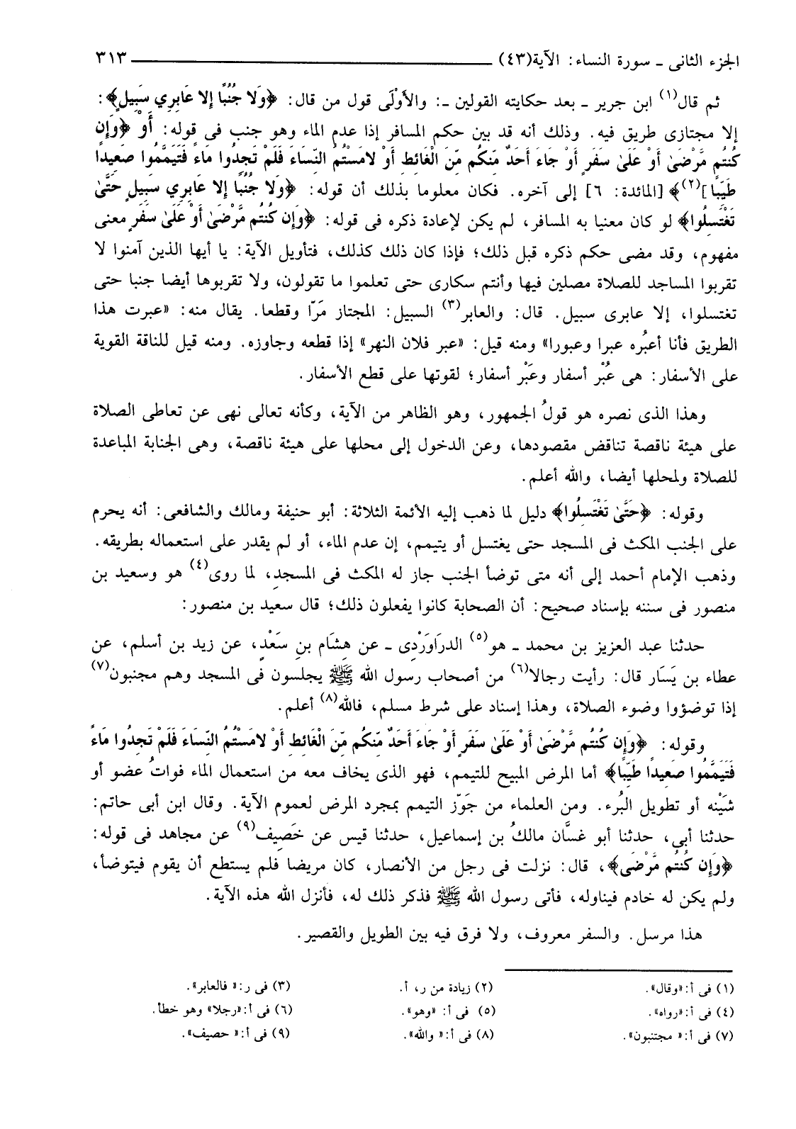 ثُمَّ قَالَ (1) ابْنُ جَرِيرٍ -بَعْدَ حِكَايَتِهِ الْقَوْلَيْنِ-: والأوْلَى قَوْلُ مَنْ قَالَ: {وَلا جُنُبًا إِلا عَابِرِي سَبِيلٍ} إِلَّا مُجْتَازِي طَرِيقٍ فِيهِ. وَذَلِكَ أَنَّهُ قَدْ بَيَّنَ حُكْمَ الْمُسَافِرِ إِذَا عَدِمَ الْمَاءَ وَهُوَ جُنُبٌ فِي قَوْلِهِ: أَوْ {وَإِنْ كُنْتُمْ مَرْضَى أَوْ عَلَى سَفَرٍ أَوْ جَاءَ أَحَدٌ مِّنْكُم مِّنَ الْغَائِطِ أَوْ لامَسْتُمُ النِّسَاءَ فَلَمْ تَجِدُوا مَاءً فَتَيَمَّمُوا صَعِيدًا طَيِّبًا (2) } [الْمَائِدَةِ: 6] إِلَى آخِرِهِ. فَكَانَ مَعْلُومًا بِذَلِكَ أَنَّ قَوْلَهُ: {وَلا جُنُبًا إِلا عَابِرِي سَبِيلٍ حَتَّى تَغْتَسِلُوا} لَوْ كَانَ مَعْنِيًّا بِهِ الْمُسَافِرُ، لَمْ يَكُنْ لِإِعَادَةِ ذِكْرِهِ فِي قَوْلِهِ: {وَإِنْ كُنْتُمْ مَرْضَى أَوْ عَلَى سَفَرٍ} مَعْنًى مَفْهُومٌ، وَقَدْ مَضَى حَكْمُ ذِكْرِهِ قَبْلَ ذَلِكَ، فَإِذَا كَانَ ذَلِكَ كَذَلِكَ، فَتَأْوِيلُ الْآيَةِ: يَا أَيُّهَا الَّذِينَ آمَنُوا لَا تَقْرَبُوا الْمَسَاجِدَ لِلصَّلَاةِ مُصَلِّينَ فِيهَا وَأَنْتُمْ سُكَارَى حَتَّى تَعْلَمُوا مَا تَقُولُونَ، وَلَا تَقْرَبُوهَا أَيْضًا جَنْبًا حَتَّى تَغْتَسِلُوا، إِلَّا عَابِرِي سَبِيلٍ. قَالَ: وَالْعَابِرُ (3) السَّبِيلَ: الْمُجْتَازُ مَرّا وَقَطْعًا. يُقَالُ مِنْهُ: "عَبَرْتُ هَذَا الطَّرِيقَ فَأَنَا أعبُره عَبْرًا وَعُبُورًا" وَمِنْهُ قِيلَ: "عَبَرَ فُلَانٌ النَّهْرَ" إِذَا قَطَعَهُ وَجَاوَزَهُ. وَمِنْهُ قِيلَ لِلنَّاقَةِ الْقَوِيَّةِ عَلَى الْأَسْفَارِ: هِيَ عُبْرُ أَسْفَارٍ وعَبْر أَسْفَارٍ؛ لِقُوَّتِهَا عَلَى قَطْعِ الْأَسْفَارِ.