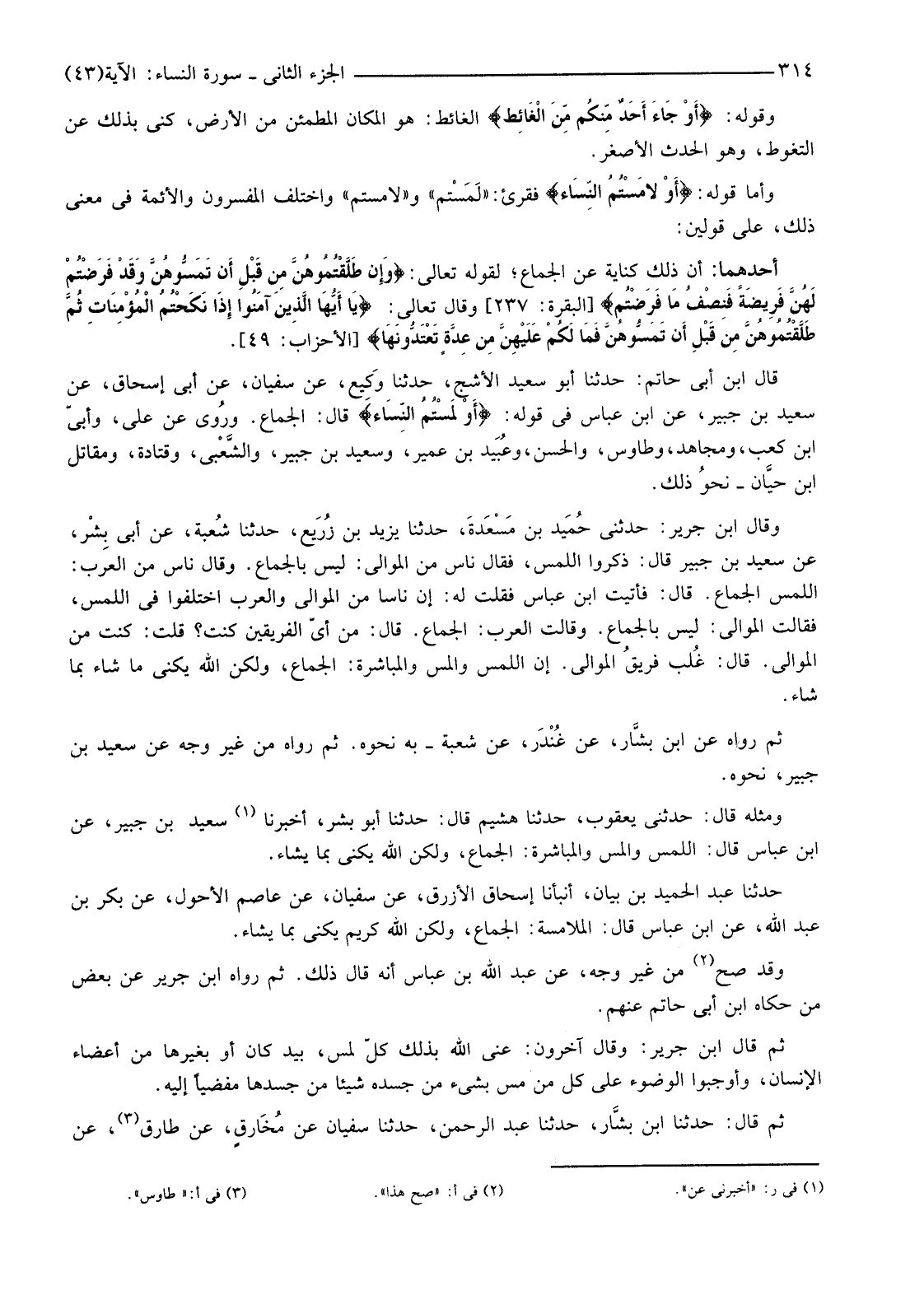وَقَالَ ابْنُ جَرِيرٍ: حَدَّثَنِي حُمَيد بْنُ مَسْعَدةَ، حَدَّثَنَا يَزِيدُ بْنُ زُرَيع، حَدَّثَنَا شُعبة، عَنْ أَبِي بِشْر، عَنْ سَعِيدِ بْنِ جُبَيْرٍ قَالَ: ذَكَرُوا اللَّمْسَ، فَقَالَ نَاسٌ مِنَ الْمَوَالِي: لَيْسَ بِالْجِمَاعِ. وَقَالَ نَاسٌ مِنَ الْعَرَبِ: اللَّمْسُ الْجِمَاعُ: قَالَ: فَأَتَيْتُ ابْنَ عَبَّاسٍ فَقُلْتُ لَهُ: إِنْ نَاسًا مِنَ الْمَوَالِي وَالْعَرَبِ اخْتَلَفُوا فِي اللَّمْسِ، فَقَالَتِ الْمَوَالِي. لَيْسَ بِالْجِمَاعِ. وَقَالْتِ الْعَرَبُ: الْجِمَاعُ. قَالَ: مِنْ أَيِّ الْفَرِيقَيْنِ كُنْتَ؟ قُلْتُ: كُنْتُ مِنَ الْمَوَالِي. قَالَ: غُلب فريقُ الْمُوَالِي. إِنَّ اللَّمْسَ وَالْمَسَّ وَالْمُبَاشَرَةَ: الْجِمَاعُ، وَلَكِنَّ اللَّهَ يُكَنِّي مَا شَاءَ بِمَا شَاءَ.