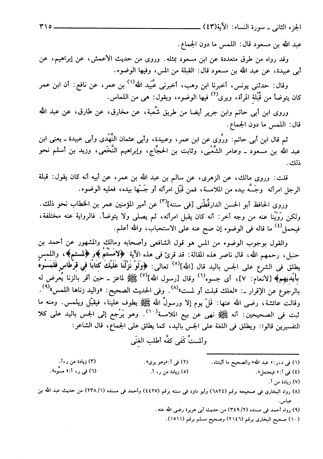وَالْقَوْلُ بِوُجُوبِ الْوُضُوءِ مِنَ الْمَسِّ هُوَ قَوْلُ الشَّافِعِيِّ وَأَصْحَابِهِ وَمَالِكٍ وَالْمَشْهُورُ عَنْ أَحْمَدَ بْنِ حَنْبَلٍ، رَحِمَهُمُ اللَّهُ، قَالَ نَاصِرُ هَذِهِ الْمَقَالَةِ: قَدْ قُرِئَ فِي هَذِهِ الْآيَةِ {لامَسْتُمُ} {وَلَمَسْتُمْ} وَاللَّمْسُ يُطْلَقُ فِي الشَّرْعِ عَلَى الْجَسِّ بِالْيَدِ قَالَ] اللَّهُ [ (5) تَعَالَى: {وَلَوْ نزلْنَا عَلَيْكَ كِتَابًا فِي قِرْطَاسٍ فَلَمَسُوهُ بِأَيْدِيهِمْ} [الْأَنْعَامِ: 7] ، أَيْ جَسُّوهُ (6) وَقَالَ [رَسُولُ اللَّهِ] (7) صَلَّى اللَّهُ عَلَيْهِ وَسَلَّمَ لِمَاعِزٍ -حِينَ أَقَرَّ بِالزِّنَا يُعرض لَهُ بِالرُّجُوعِ عَنِ الْإِقْرَارِ-: "لَعَلَّكَ قَبَّلْتَ أَوْ لَمَسْتَ" (8) وَفِي الْحَدِيثِ الصَّحِيحِ: "وَالْيَدُ زِنَاهَا اللَّمْسُ" وَقَالَتْ عَائِشَةُ، رَضِيَ اللَّهُ عَنْهَا: قَلّ يَوْمٌ إِلَّا ورسولُ اللَّهِ صَلَّى اللَّهُ عَلَيْهِ وَسَلَّمَ يَطُوفُ عَلَيْنَا، فَيُقَبِّلُ وَيَلْمِسُ. وَمِنْهُ مَا ثَبَتَ فِي الصحيحين: أَنَّهُ رَسُولُ اللَّهِ صَلَّى اللَّهُ عَلَيْهِ وَسَلَّمَ نَهَى عَنْ بَيْعِ الْمُلَامَسَةِ (9) وَهُوَ يَرْجع إِلَى الْجَسِّ بِالْيَدِ عَلَى كِلَا التَّفْسِيرَيْنِ قَالُوا: وَيُطْلَقُ فِي اللُّغَةِ عَلَى الْجَسِّ بِالْيَدِ، كَمَا يُطْلَقُ عَلَى الْجِمَاعِ، قَالَ الشَّاعِرُ: