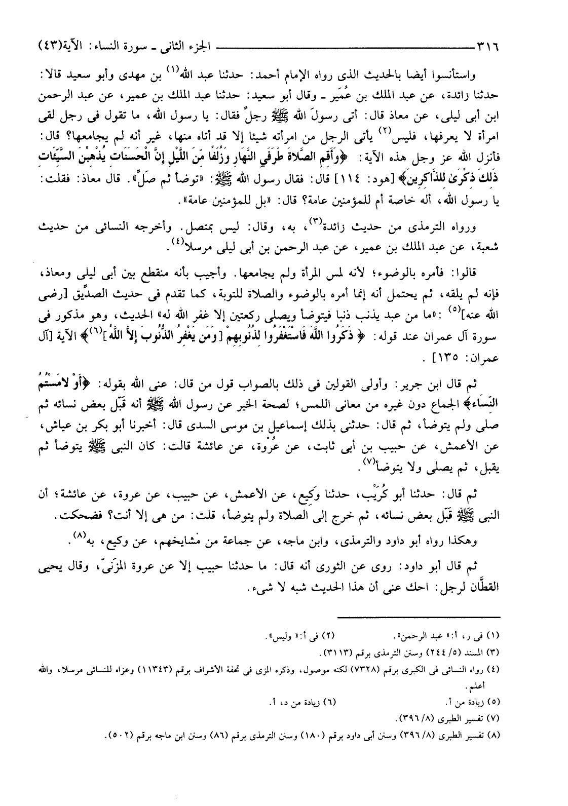 (8) تفسير الطبري (8/396) وسنن أبي داود برقم (180) وسنن الترمذي برقم (86) وسنن ابن ماجه برقم (502) .