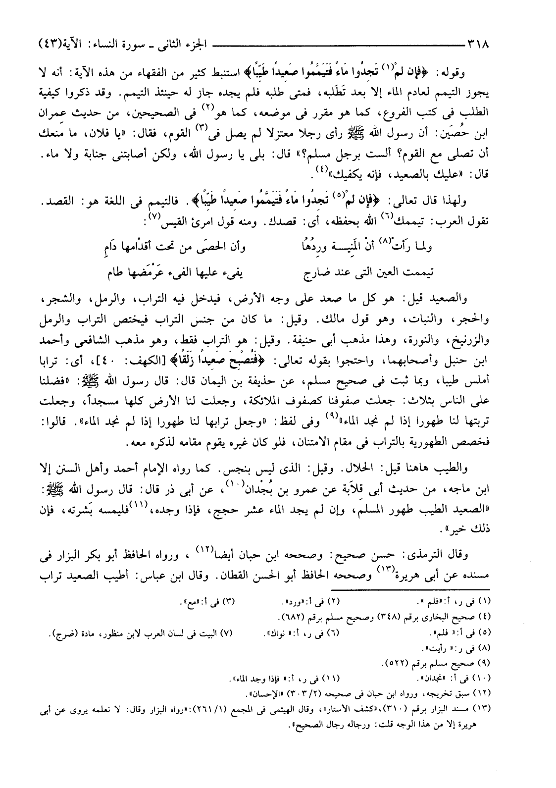 وَلِهَذَا قَالَ تَعَالَى: {فَإِنْ لَمْ (5) تَجِدُوا مَاءً فَتَيَمَّمُوا صَعِيدًا طَيِّبًا} فَالتَّيَمُّمُ فِي اللُّغَةِ هُوَ: الْقَصْدُ. تَقُولُ الْعَرَبُ: تَيَمَّمَكَ (6) اللَّهُ بِحِفْظِهِ، أَيْ: قَصَدَكَ. وَمِنْهُ قَوْلُ امْرِئِ الْقَيْسِ (7) وَلَمَّا رَأتْ (8) أنَّ المَنِية ورِدُها ... وَأَنَّ الحصَى مِنْ تَحْتِ أَقْدَامِهَا دَامِ ...