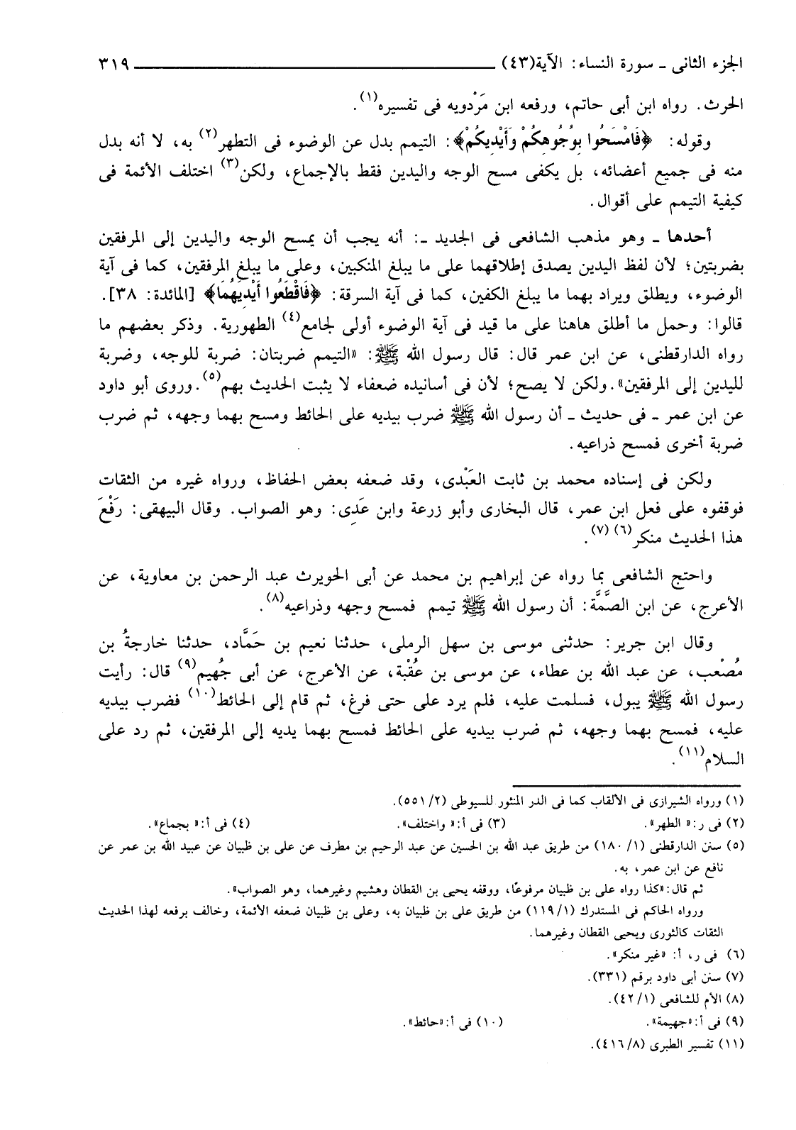 أَحَدُهَا -وَهُوَ مَذْهَبُ الشَّافِعِيِّ فِي الْجَدِيدِ-: أَنَّهُ يَجِبُ أَنْ يَمْسَحَ الْوَجْهَ وَالْيَدَيْنِ إِلَى الْمَرْفِقَيْنِ بِضَرْبَتَيْنِ؛ لِأَنَّ لَفْظَ الْيَدَيْنِ يَصْدُقُ إِطْلَاقُهُمَا عَلَى مَا يَبْلُغُ الْمَنْكِبَيْنِ، وَعَلَى مَا يَبْلُغُ الْمِرْفَقَيْنِ، كَمَا فِي آيَةِ الْوُضُوءِ، وَيُطْلَقُ وَيُرَادُ بِهِمَا مَا يَبْلُغُ الْكَفَّيْنِ، كَمَا فِي آيَةِ السَّرِقَةِ: {فَاقْطَعُوا أَيْدِيَهُمَا} [الْمَائِدَةِ: 38] قَالُوا: وَحَمْلُ مَا أُطْلِقَ هَاهُنَا عَلَى مَا قُيِّدَ فِي آيَةِ الْوُضُوءِ أَوْلَى لِجَامِعِ (4) الطَّهُورِيَّةِ. وَذَكَرَ بَعْضُهُمْ مَا رَوَاهُ الدَّارَقُطْنِيُّ، عَنِ ابْنِ عُمَرَ قَالَ: قَالَ رَسُولُ اللَّهِ صَلَّى اللَّهُ عَلَيْهِ وَسَلَّمَ: "التَّيَمُّمُ ضَرْبَتَانِ: ضَرْبَةٌ لِلْوَجْهِ، وَضَرْبَةٌ لِلْيَدَيْنِ إِلَى الْمِرْفَقَيْنِ". وَلَكِنْ لَا يَصِحُّ؛ لِأَنَّ فِي أَسَانِيدِهِ ضُعَفَاءُ لَا يَثْبُتُ الْحَدِيثُ بِهِمْ (5) وَرَوَى أَبُو دَاوُدَ عَنِ ابْنِ عُمَرَ -فِي حَدِيثٍ-أَنَّ رَسُولَ اللَّهِ صَلَّى اللَّهُ عَلَيْهِ وَسَلَّمَ ضَرْبَ بِيَدَيْهِ عَلَى الْحَائِطِ وَمَسْحَ بِهِمَا وَجْهَهُ، ثُمَّ ضَرَبَ ضَرْبَةً أُخْرَى فَمَسَحَ بِهَا ذِرَاعَيْهِ.