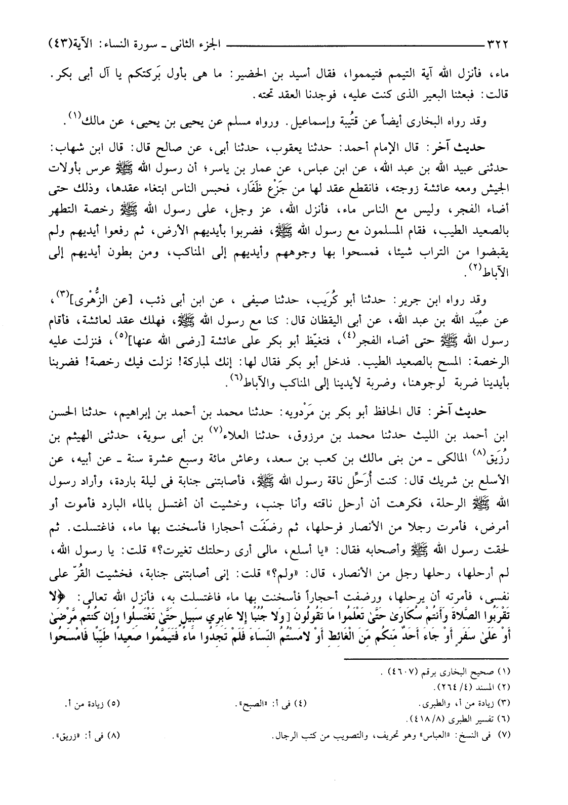 وَقَدْ رَوَاهُ ابْنُ جَرِيرٍ: حَدَّثَنَا أَبُو كُرَيْب، حَدَّثَنَا صَيْفِيٌّ، عَنِ ابْنِ أَبِي ذِئْبٍ،] عَنِ الزُّهْرى [ (3) عَنْ عُبَيْدِ اللَّهِ بْنِ عَبْدِ اللَّهِ، عن أَبِي الْيَقْظَانِ قَالَ: كُنَّا مَعَ رَسُولِ اللَّهِ صَلَّى اللَّهُ عَلَيْهِ وَسَلَّمَ، فَهَلَكَ عِقْدٌ لِعَائِشَةَ، فَأَقَامَ رَسُولُ اللَّهِ صَلَّى اللَّهُ عَلَيْهِ وَسَلَّمَ حَتَّى أَضَاءَ الْفَجْرُ (4) فَتَغَيَّظَ أَبُو بَكْرٍ عَلَى عَائِشَةَ] رَضِيَ اللَّهُ عَنْهَا [ (5) فَنَزَلَتْ عَلَيْهِ الرُّخْصَةُ: الْمَسْحُ بِالصَّعِيدِ الطَّيِّبِ. فَدَخَلَ أَبُو بَكْرٍ فَقَالَ لَهَا: إِنَّكِ لَمُبَارَكَةٌ! نَزَلَتْ فِيكِ رُخْصَةٌ! فَضَرَبْنَا بِأَيْدِينَا ضَرْبَةً لِوُجُوهِنَا، وَضَرْبَةً لِأَيْدِينَا إِلَى الْمَنَاكِبِ وَالْآبَاطِ. (6)
