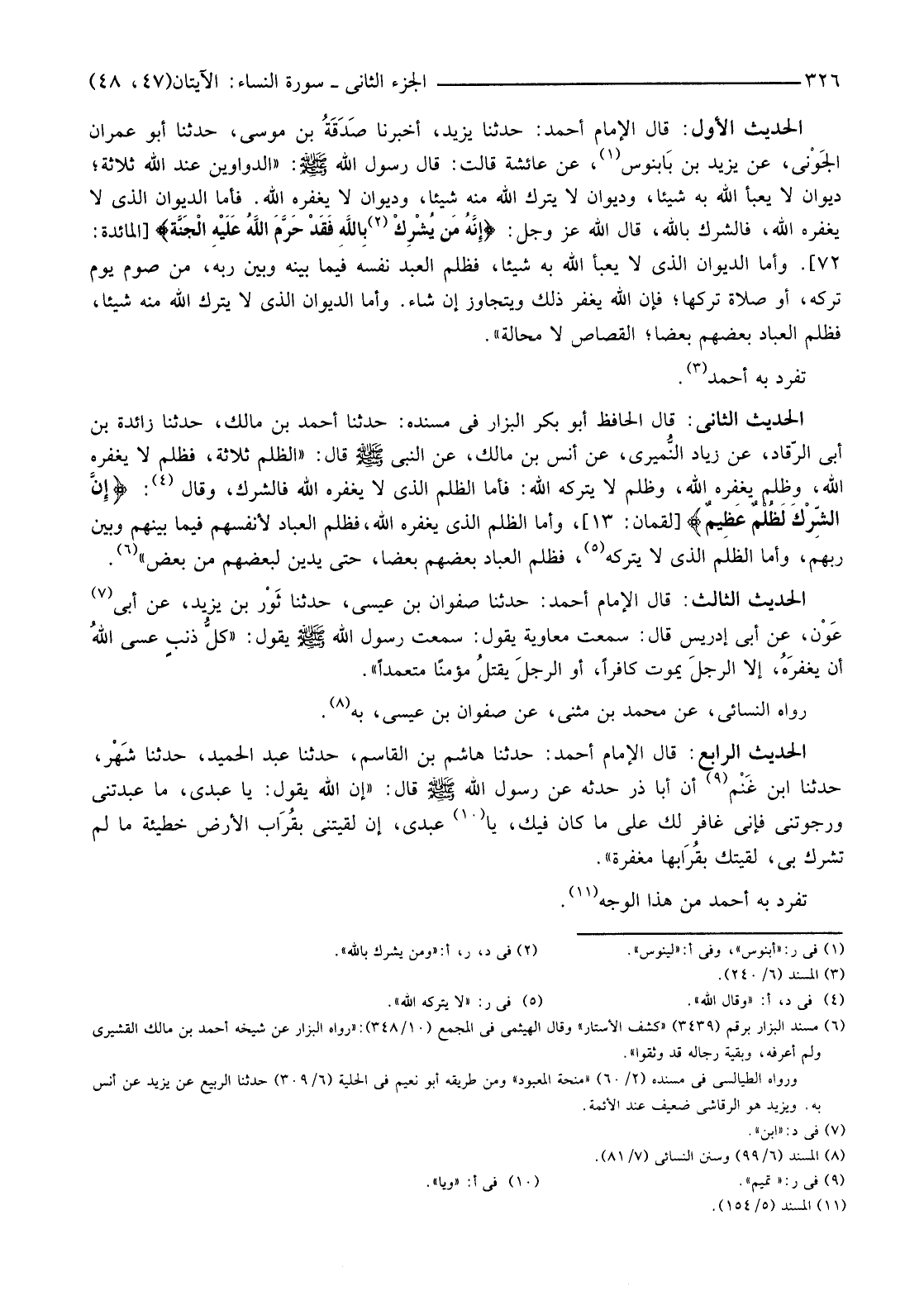الْحَدِيثُ الْأَوَّلُ: قَالَ الْإِمَامُ أَحْمَدُ: حَدَّثَنَا يَزِيدُ، أَخْبَرَنَا صَدَقَةُ بْنُ مُوسَى، حَدَّثَنَا أَبُو عِمْرَانَ الْجَوْنِيُّ، عَنْ يَزِيدَ بْنِ بَابَنُوسَ (1) عَنْ عَائِشَةَ قَالَتْ: قَالَ رَسُولُ اللَّهِ صَلَّى اللَّهُ عَلَيْهِ وَسَلَّمَ: "الدَّوَاوِينُ عِنْدَ اللَّهِ ثَلَاثَةٌ؛ دِيوَانٌ لَا يَعْبَأُ اللَّهُ بِهِ شَيْئًا، وَدِيوَانٌ لَا يَتْرُكُ اللَّهُ مِنْهُ شَيْئًا، وَدِيوَانٌ لَا يَغْفِرُهُ اللَّهُ. فَأَمَّا الدِّيوَانُ الَّذِي لَا يَغْفِرُهُ اللَّهُ، فَالشِّرْكُ بِاللَّهِ، قَالَ اللَّهُ عَزَّ وَجَلَّ: {إِنَّهُ مَنْ يُشْرِكْ بِاللَّهِ فَقَدْ حَرَّمَ اللَّهُ عَلَيْهِ الْجَنَّةَ} [الْمَائِدَةِ:72] وَأَمَّا الدِّيوَانُ الَّذِي لَا يَعْبَأُ اللَّهُ بِهِ شَيْئًا، فَظُلْمُ الْعَبْدِ نَفْسَهُ فِيمَا بَيْنَهُ وَبَيْنَ رَبِّهِ، مِنْ صَوْمِ يَوْمٍ تَرْكَهُ، أَوْ صَلَاةٍ تَرْكَهَا؛ فَإِنَّ اللَّهَ يَغْفِرُ ذَلِكَ وَيَتَجَاوَزُ إِنْ شَاءَ. وَأَمَّا الدِّيوَانُ الَّذِي لَا يَتْرُكُ اللَّهُ مِنْهُ شَيْئًا، فَظُلْمُ الْعِبَادِ بَعْضِهِمْ بَعْضًا؛ الْقَصَاصُ لَا مَحَالَةَ".