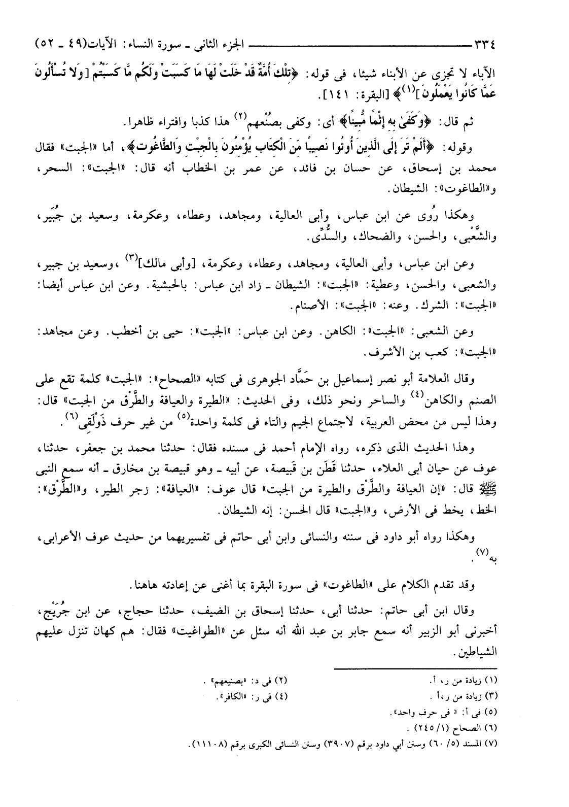 وَقَوْلُهُ: {أَلَمْ تَرَ إِلَى الَّذِينَ أُوتُوا نَصِيبًا مِنَ الْكِتَابِ يُؤْمِنُونَ بِالْجِبْتِ وَالطَّاغُوتِ} أَمَّا "الْجِبْتُ" فَقَالَ مُحَمَّدُ بْنُ إِسْحَاقَ، عَنْ حَسَّانَ بْنِ فَائِدٍ، عَنْ عُمَرَ بْنِ الْخَطَّابِ أَنَّهُ قَالَ: "الْجِبْتُ": السِّحْرُ، وَ "الطَّاغُوتُ": الشَّيْطَانُ.