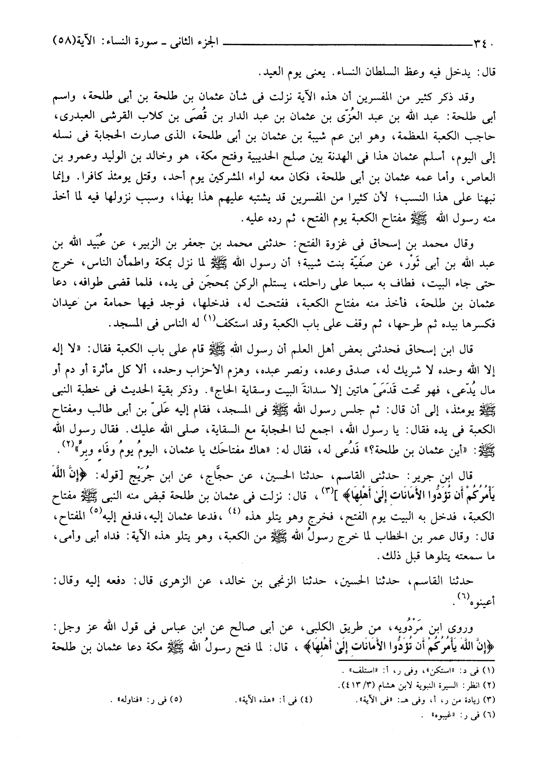 قَالَ: يَدْخُلُ فِيهِ وَعْظُ السُّلْطَانِ النِّسَاءَ. يَعْنِي يَوْمَ الْعِيدِ. وَقَدْ ذَكَرَ كَثِيرٌ مِنَ الْمُفَسِّرِينَ أَنَّ هَذِهِ الْآيَةَ نَزَلَتْ فِي شَأْنِ عُثْمَانَ بْنِ طَلْحَةَ بْنِ أَبِي طَلْحَةَ، وَاسْمُ أَبِي طَلْحَةَ، عَبْدُ اللَّهِ بْنِ عَبْدِ الْعُزَّى بْنِ عُثْمَانَ بْنِ عَبْدِ الدَّارِ بْنِ قُصَيِّ بْنِ كِلَابٍ الْقُرَشِيُّ الْعَبْدَرِيُّ، حَاجِبُ الْكَعْبَةِ الْمُعَظَّمَةِ، وَهُوَ ابْنُ عَمِّ شَيْبَةَ بْنِ عُثْمَانَ بْنِ أَبِي طَلْحَةَ، الَّذِي صَارْتِ الْحِجَابَةُ فِي نَسْلِهِ إِلَى الْيَوْمِ، أَسْلَمَ عُثْمَانُ هَذَا فِي الْهُدْنَةِ بَيْنَ صُلْحِ الْحُدَيْبِيَةِ وَفْتُحِ مَكَّةَ، هُوَ وَخَالِدُ بْنُ الْوَلِيدِ وَعَمْرُو بْنُ الْعَاصِ، وَأَمَّا عَمُّهُ عُثْمَانُ بْنُ أَبِي طَلْحَةَ، فَكَانَ مَعَهُ لِوَاءُ الْمُشْرِكِينَ يَوْمَ أُحُدٍ، وَقُتِلَ يَوْمَئِذٍ كَافِرًا. وَإِنَّمَا نَبَّهْنَا عَلَى هَذَا النَّسَبِ؛ لِأَنَّ كَثِيرًا مِنَ الْمُفَسِّرِينَ قَدْ يَشْتَبِهُ عَلَيْهِمْ هَذَا بِهَذَا، وَسَبَبُ نُزُولِهَا فِيهِ لَمَّا أَخَذَ مِنْهُ رَسُولَ اللَّهِ صَلَّى اللَّهُ عَلَيْهِ وَسَلَّمَ مِفْتَاحَ الْكَعْبَةِ يَوْمَ الْفَتْحِ، ثُمَّ رَدَّهُ عَلَيْهِ.