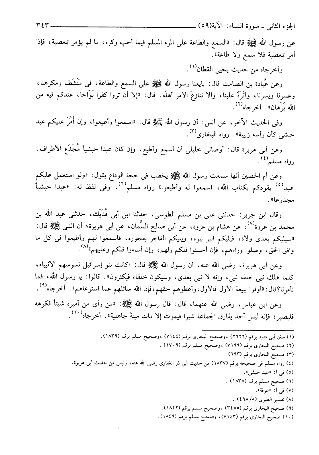 وَعَنْ عُبَادَةَ بْنِ الصَّامِتِ قَالَ: بَايَعْنَا رَسُولَ اللَّهِ صَلَّى اللَّهُ عَلَيْهِ وَسَلَّمَ عَلَى السَّمْعِ وَالطَّاعَةِ، فِي مَنْشَطنا وَمَكْرَهِنَا، وَعُسْرِنَا وَيُسْرِنَا، وأثَرَةٍ عَلَيْنَا، وَأَلَّا نُنَازِعَ الْأَمْرَ أَهْلَهُ. قَالَ: "إِلَّا أَنْ تَرَوْا كُفْرًا بَوَاحا، عِنْدَكُمْ فِيهِ مِنَ اللَّهِ بُرْهَانٌ" أَخْرَجَاهُ (2) .