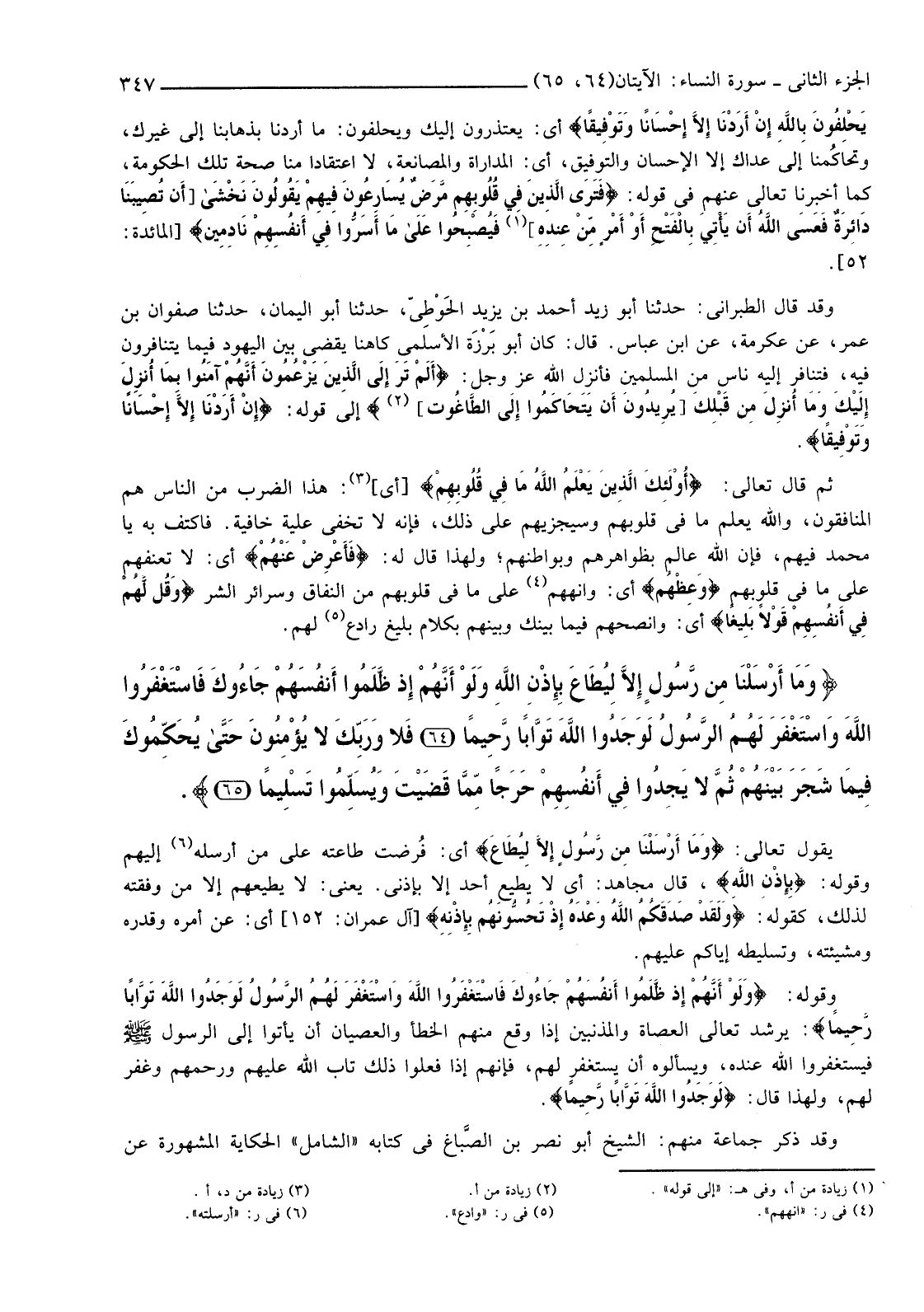 {وَمَا أَرْسَلْنَا مِنْ رَسُولٍ إِلا لِيُطَاعَ بِإِذْنِ اللَّهِ وَلَوْ أَنَّهُمْ إِذْ ظَلَمُوا أَنْفُسَهُمْ جَاءُوكَ فَاسْتَغْفَرُوا اللَّهَ وَاسْتَغْفَرَ لَهُمُ الرَّسُولُ لَوَجَدُوا اللَّهَ تَوَّابًا رَحِيمًا (64) فَلا وَرَبِّكَ لَا يُؤْمِنُونَ حَتَّى يُحَكِّمُوكَ فِيمَا شَجَرَ بَيْنَهُمْ ثُمَّ لَا يَجِدُوا فِي أَنْفُسِهِمْ حَرَجًا مِمَّا قَضَيْتَ وَيُسَلِّمُوا تَسْلِيمَا (65) }