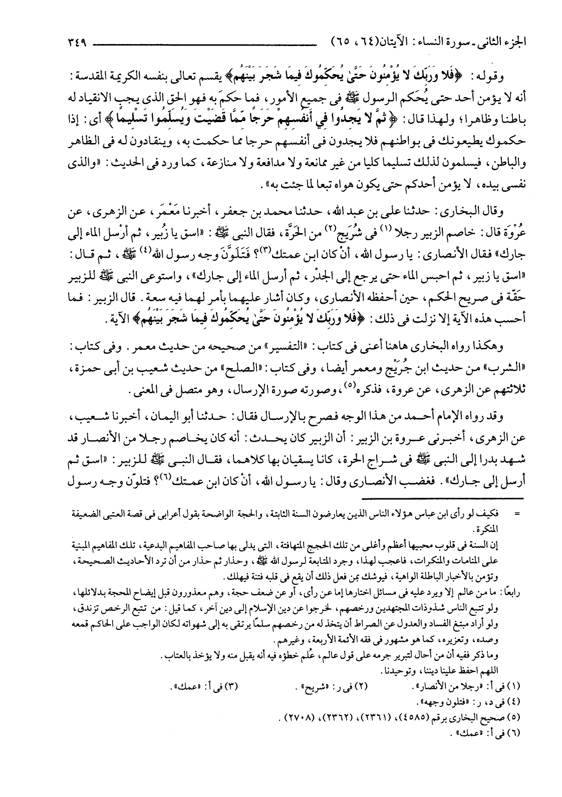 وَقَوْلُهُ: {فَلا وَرَبِّكَ لَا يُؤْمِنُونَ حَتَّى يُحَكِّمُوكَ فِيمَا شَجَرَ بَيْنَهُمْ} يُقْسِمُ تَعَالَى بِنَفْسِهِ الْكَرِيمَةِ الْمُقَدَّسَةِ: أَنَّهُ لَا يُؤْمِنُ أَحَدٌ حَتَّى يُحَكم الرَّسُولَ صَلَّى اللَّهُ عَلَيْهِ وَسَلَّمَ فِي جَمِيعِ الْأُمُورِ، فَمَا حَكَمَ بِهِ فَهُوَ الْحَقُّ الَّذِي يَجِبُ الِانْقِيَادُ لَهُ بَاطِنًا وَظَاهِرًا؛ وَلِهَذَا قَالَ: {ثُمَّ لَا يَجِدُوا فِي أَنْفُسِهِمْ حَرَجًا مِمَّا قَضَيْتَ وَيُسَلِّمُوا تَسْلِيمًا} أَيْ: إِذَا حَكَّمُوكَ يُطِيعُونَكَ فِي بَوَاطِنِهِمْ فَلَا يَجِدُونَ فِي أَنْفُسِهِمْ حَرَجًا مِمَّا حَكَمْتَ بِهِ، وَيَنْقَادُونَ لَهُ فِي الظَّاهِرِ وَالْبَاطِنِ فَيُسَلِّمُونَ لِذَلِكَ تَسْلِيمًا كُلِّيًّا مِنْ غَيْرِ مُمَانِعَةٍ وَلَا مُدَافِعَةٍ وَلَا مُنَازِعَةٍ، كَمَا وَرَدَ فِي الْحَدِيثِ: "وَالَّذِي نَفْسِي بِيَدِهِ لَا يُؤْمِنُ أَحَدُكُمْ حَتَّى يَكُونَ هَوَاهُ تَبَعًا لِمَا جِئْتُ بِهِ".