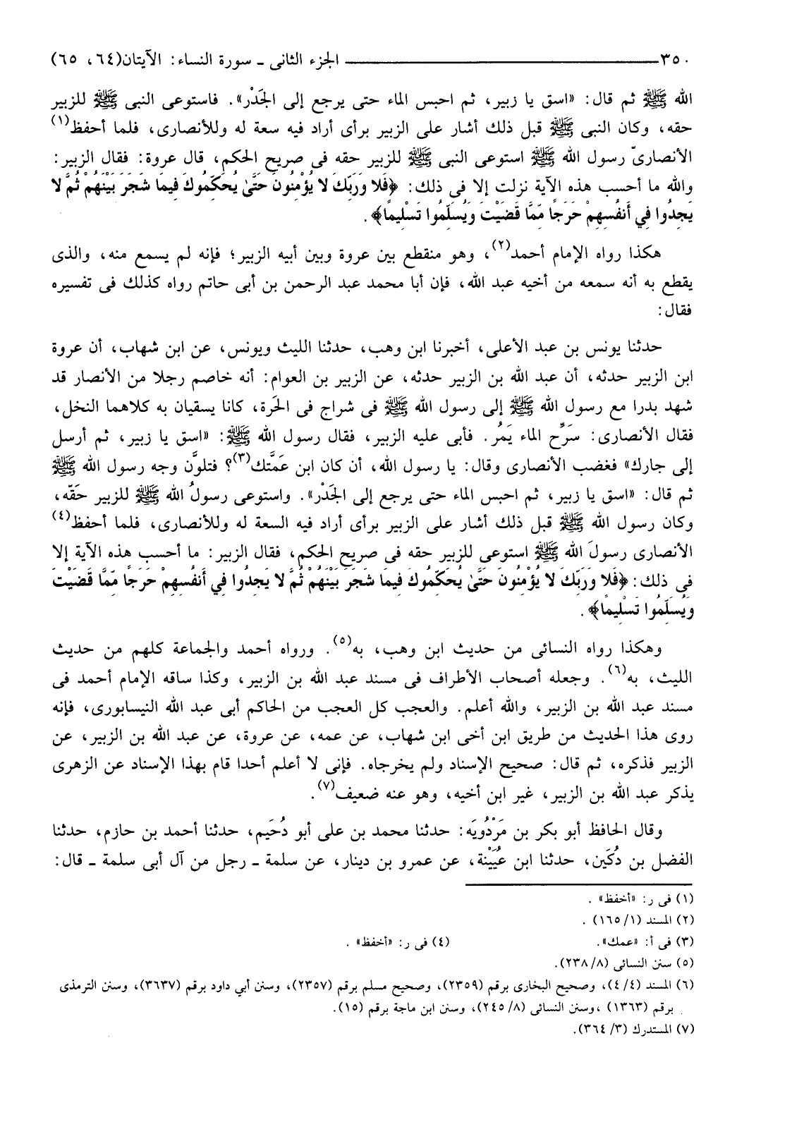 اللَّهِ صَلَّى اللَّهُ عَلَيْهِ وَسَلَّمَ ثُمَّ قَالَ: "اسْقِ يَا زُبَيْرُ ثُمَّ احْبِسِ الْمَاءَ حَتَّى يَرْجِعَ إِلَى الجَدْر" فَاسْتَوْعَى النَّبِيُّ صَلَّى اللَّهُ عَلَيْهِ وَسَلَّمَ لِلزُّبَيْرِ حَقَّهُ وَكَانَ النَّبِيُّ صَلَّى اللَّهُ عَلَيْهِ وَسَلَّمَ قَبْلَ ذَلِكَ أَشَارَ عَلَى الزُّبَيْرِ بِرَأْيٍ أَرَادَ فِيهِ سَعَةً لَهُ وَلِلْأَنْصَارِيِّ، فَلَمَّا أَحْفَظَ (1) الْأَنْصَارِيُّ رَسُولَ اللَّهِ صَلَّى اللَّهُ عَلَيْهِ وَسَلَّمَ اسْتَوْعَى النَّبِيُّ صَلَّى اللَّهُ عَلَيْهِ وَسَلَّمَ لِلزُّبَيْرِ حَقَّهُ فِي صَرِيحِ الْحُكْمِ، قَالَ عُرْوَةُ: فَقَالَ الزُّبَيْرُ: وَاللَّهِ مَا أَحْسَبُ هَذِهِ الْآيَةَ نَزَلَتْ إِلَّا فِي ذَلِكَ: {فَلا وَرَبِّكَ لَا يُؤْمِنُونَ حَتَّى يُحَكِّمُوكَ فِيمَا شَجَرَ بَيْنَهُمْ ثُمَّ لَا يَجِدُوا فِي أَنْفُسِهِمْ حَرَجًا مِمَّا قَضَيْتَ وَيُسَلِّمُوا تَسْلِيمًا}