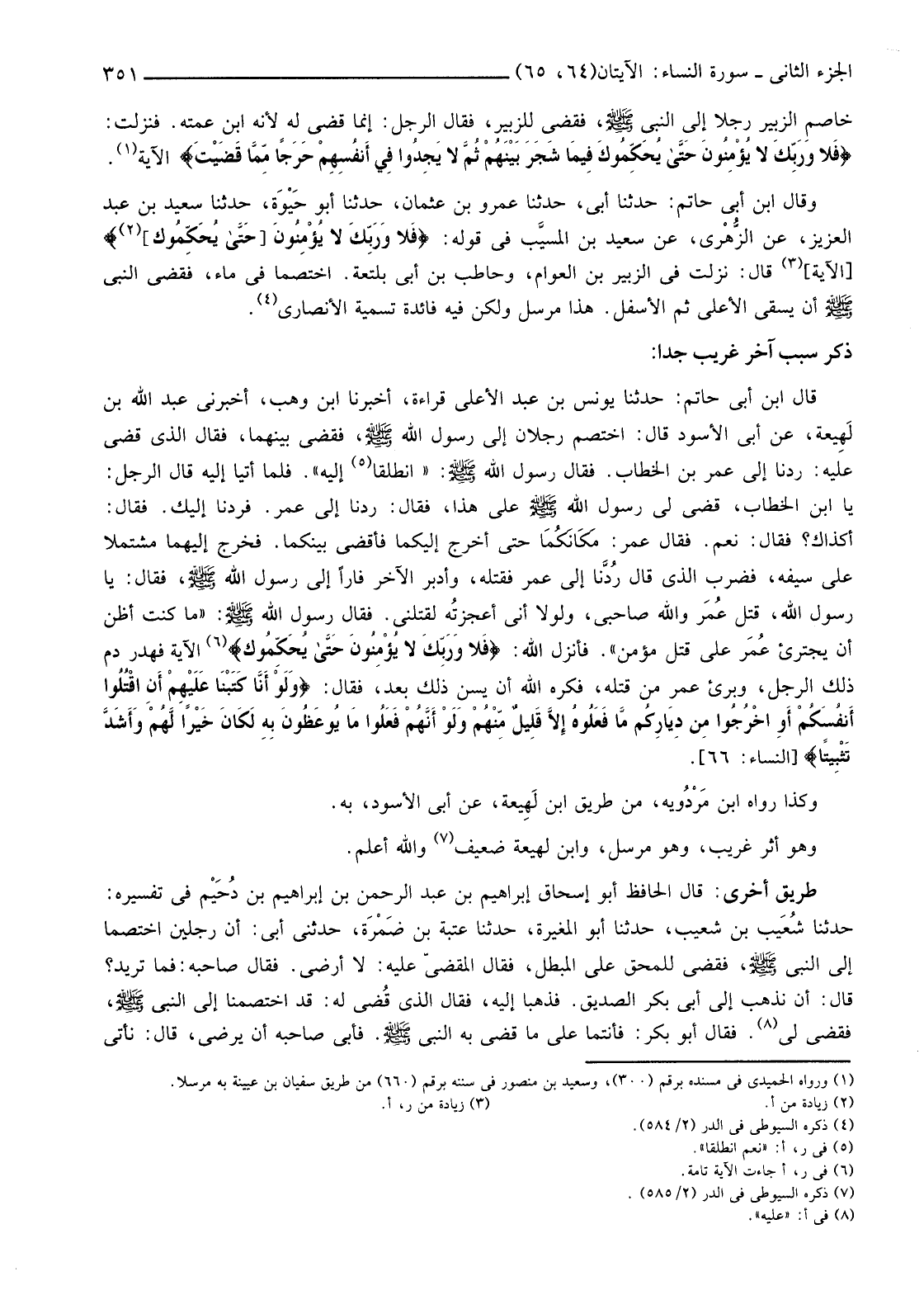 قَالَ ابْنُ أَبِي حَاتِمٍ: حَدَّثَنَا يُونُسُ بْنُ عَبْدِ الْأَعْلَى قِرَاءَةً، أَخْبَرَنَا ابْنُ وَهْبٍ، أَخْبَرَنِي عَبْدُ اللَّهِ بْنُ لَهِيعة، عَنْ أَبِي الْأُسُودِ قَالَ: اخْتَصَمَ رَجُلَانِ إِلَى رَسُولِ الله صلى الله عليه وسلم فقضى بَيْنَهُمَا، فَقَالَ الَّذِي قُضِيَ عَلَيْهِ: رُدَّنَا إِلَى عُمَرَ بْنِ الْخَطَّابِ فَقَالَ رَسُولُ اللَّهِ صَلَّى اللَّهُ عَلَيْهِ وَسَلَّمَ: "انْطَلِقَا (5) إِلَيْهِ" فَلَمَّا أَتَيَا إِلَيْهِ قَالَ الرَّجُلُ: يَا ابْنَ الْخَطَّابِ، قَضَى لِي رَسُولُ اللَّهِ صَلَّى اللَّهُ عَلَيْهِ وَسَلَّمَ عَلَى هَذَا، فَقَالَ: رُدَّنَا إِلَى عُمَرَ. فَرَدَّنَا إِلَيْكَ. فَقَالَ: أَكَذَاكَ؟ فَقَالَ: نَعَمْ فَقَالَ عُمَرُ: مَكَانَكُمَا حَتَّى أَخْرُجَ إِلَيْكُمَا فَأَقْضِيَ بَيْنَكُمَا. فَخَرَجَ إِلَيْهِمَا مُشْتَمِلًا عَلَى سَيْفِهِ، فَضَرَبَ الَّذِي قَالَ رُدَّنا إِلَى عُمَرَ فَقَتَلَهُ، وَأَدْبَرَ الْآخَرُ فَارًّا إلى رسول الله صلى الله عليه وسلم فَقَالَ: يَا رَسُولَ اللَّهِ قَتَلَ عُمَر وَاللَّهِ صَاحِبِي، وَلَوْلَا أَنِّي أعجزتُه لَقَتَلَنِي، فَقَالَ رَسُولُ اللَّهِ صَلَّى اللَّهُ عَلَيْهِ وَسَلَّمَ: "مَا كُنْتُ أَظُنُّ أَنْ يَجْتَرِئَ عُمَر عَلَى قَتْلِ مُؤْمِنٍ" فَأَنْزَلَ اللَّهُ: {فَلا وَرَبِّكَ لَا يُؤْمِنُونَ حَتَّى يُحَكِّمُوكَ} (6) الْآيَةَ، فَهَدَرَ دَمَ ذَلِكَ الرَّجُلِ، وَبَرِئَ عُمَرُ مِنْ قَتْلِهِ، فَكَرِهَ اللَّهُ أَنْ يُسَنَّ ذَلِكَ بَعْدُ، فَقَالَ: {وَلَوْ أَنَّا كَتَبْنَا عَلَيْهِمْ أَنِ اقْتُلُوا أَنْفُسَكُمْ أَوِ اخْرُجُوا مِنْ دِيَارِكُمْ مَا فَعَلُوهُ إِلا قَلِيلٌ مِنْهُمْ وَلَوْ أَنَّهُمْ فَعَلُوا مَا يُوعَظُونَ بِهِ لَكَانَ خَيْرًا لَهُمْ وَأَشَدَّ تَثْبِيتًا} [النِّسَاءِ: 66] .