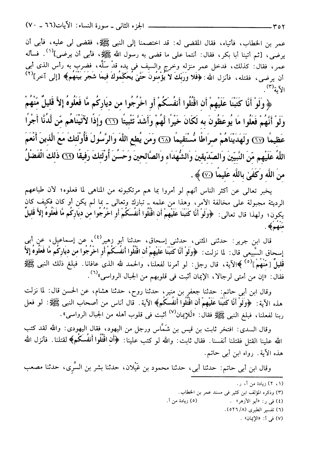 قَالَ ابْنُ جَرِيرٍ: حَدَّثَنِي الْمُثَنَّى، حَدَّثَنِي إِسْحَاقُ، حَدَّثَنَا أَبُو زُهَيْرٍ (1) عَنْ إِسْمَاعِيلَ، عَنْ أَبِي إِسْحَاقَ السَّبِيعِيِّ، قَالَ: لَمَّا نَزَلَتْ: {وَلَوْ أَنَّا كَتَبْنَا عَلَيْهِمْ أَنْ اقْتُلُوا أَنْفُسَكُمْ أَوْ اخْرُجُوا مِنْ دِيَارِكُمْ مَا فَعَلُوهْ إِلَّا قَلِيلٌ [مِنْهُمْ] (2) } الْآيَةَ، قَالَ رَجُلٌ: لَوْ أُمِرْنَا لَفَعَلْنَا، وَالْحَمْدُ لِلَّهِ الَّذِي عَافَانَا. فَبَلَغَ ذَلِكَ النَّبِيَّ صَلَّى اللَّهُ عَلَيْهِ وَسَلَّمَ فَقَالَ: "إِنَّ مِنْ أُمَّتِي لَرِجَالًا الْإِيمَانُ أَثْبَتُ فِي قُلُوبِهِمْ مِنَ الْجِبَالِ الرَّوَاسِي" (3) .