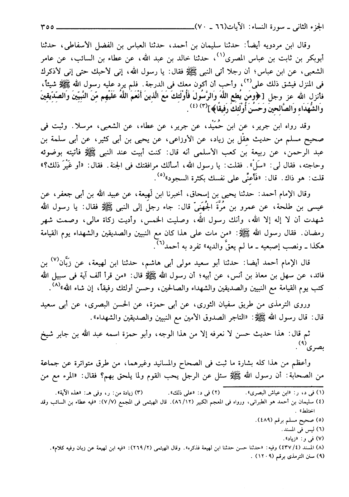 وَقَالَ ابْنُ مَرْدَوَيْهِ أَيْضًا: حَدَّثَنَا سُلَيْمَانُ بْنُ أَحْمَدَ، حَدَّثَنَا الْعَبَّاسُ بْنُ الْفَضْلِ الْأَسْفَاطِيُّ، حَدَّثَنَا أَبُو بَكْرِ بْنُ ثَابِتِ بْنِ عَبَّاسٍ الْمِصْرِيُّ (1) حَدَّثَنَا خَالِدُ بْنِ عَبْدِ اللَّهِ، عَنْ عَطَاءِ بْنِ السَّائِبِ، عَنْ عَامِرٍ الشَّعْبِيِّ، عَنِ ابْنِ عَبَّاسٍ، أَنَّ رَجُلًا أَتَى النَّبِيَّ صَلَّى اللَّهُ عَلَيْهِ وَسَلَّمَ فَقَالَ: يَا رَسُولَ اللَّهِ، إِنِّي لِأُحِبُّكَ حَتَّى إِنِّي لَأَذَكُرُكَ فِي الْمُنَزَّلِ فَيَشُقُّ ذَلِكَ عَلَيَّ (2) وَأُحِبُّ أَنْ أَكُونَ مَعَكَ فِي الدَّرَجَةِ. فَلَمْ يَرُدَّ عَلَيْهِ رَسُولُ اللَّهِ صَلَّى اللَّهُ عَلَيْهِ وَسَلَّمَ شَيْئًا، فَأَنْزَلَ اللَّهُ عَزَّ وَجَلَّ [ {وَمَنْ يُطِعِ اللهَ وَالرَّسُولَ فَأُولَئِكَ مَعَ الَّذِينَ أَنْعَم اللهُ عَلَيْهِمْ مِنَ النَّبِيِّينَ وَالصِّدِّيقِينَ وَالشُّهَدَاءِ وِالصَّالِحِينَ وَحَسُنَ أُولَئِكَ رَفِيقًا} (3) ] (4) .