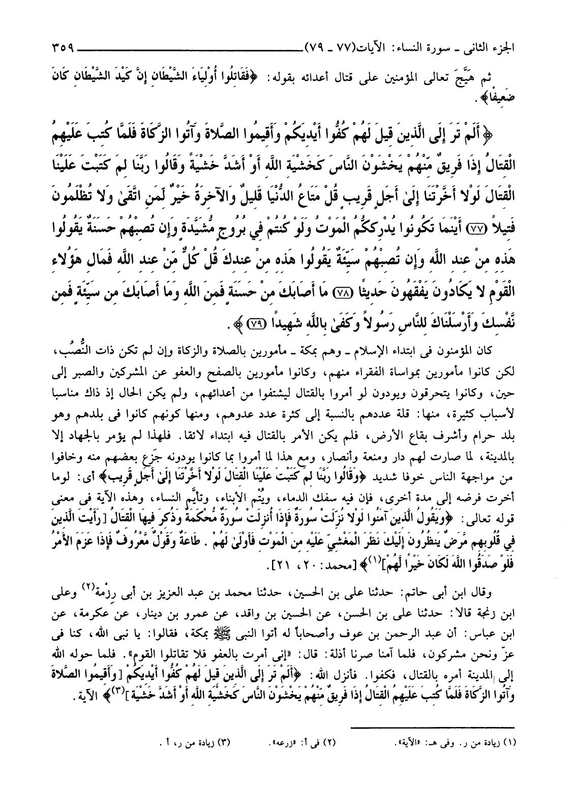 {أَلَمْ تَرَ إِلَى الَّذِينَ قِيلَ لَهُمْ كُفُّوا أَيْدِيَكُمْ وَأَقِيمُوا الصَّلاةَ وَآتُوا الزَّكَاةَ فَلَمَّا كُتِبَ عَلَيْهِمُ الْقِتَالُ إِذَا فَرِيقٌ مِنْهُمْ يَخْشَوْنَ النَّاسَ كَخَشْيَةِ اللَّهِ أَوْ أَشَدَّ خَشْيَةً وَقَالُوا رَبَّنَا لِمَ كَتَبْتَ عَلَيْنَا الْقِتَالَ لَوْلا أَخَّرْتَنَا إِلَى أَجَلٍ قَرِيبٍ قُلْ مَتَاعُ الدُّنْيَا قَلِيلٌ وَالآخِرَةُ خَيْرٌ لِمَنِ اتَّقَى وَلا تُظْلَمُونَ فَتِيلا (77) أَيْنَمَا تَكُونُوا يُدْرِكُكُمُ الْمَوْتُ وَلَوْ كُنْتُمْ فِي بُرُوجٍ مُشَيَّدَةٍ وَإِنْ تُصِبْهُمْ حَسَنَةٌ يَقُولُوا هَذِهِ مِنْ عِنْدِ اللَّهِ وَإِنْ تُصِبْهُمْ سَيِّئَةٌ يَقُولُوا هَذِهِ مِنْ عِنْدِكَ قُلْ كُلٌّ مِنْ عِنْدِ اللَّهِ فَمَالِ هَؤُلاءِ الْقَوْمِ لَا يَكَادُونَ يَفْقَهُونَ حَدِيثًا (78) مَا أَصَابَكَ مِنْ حَسَنَةٍ فَمِنَ اللَّهِ وَمَا أَصَابَكَ مِنْ سَيِّئَةٍ فَمِنْ نَفْسِكَ وَأَرْسَلْنَاكَ لِلنَّاسِ رَسُولا وَكَفَى بِاللَّهِ شَهِيدًا (79) }