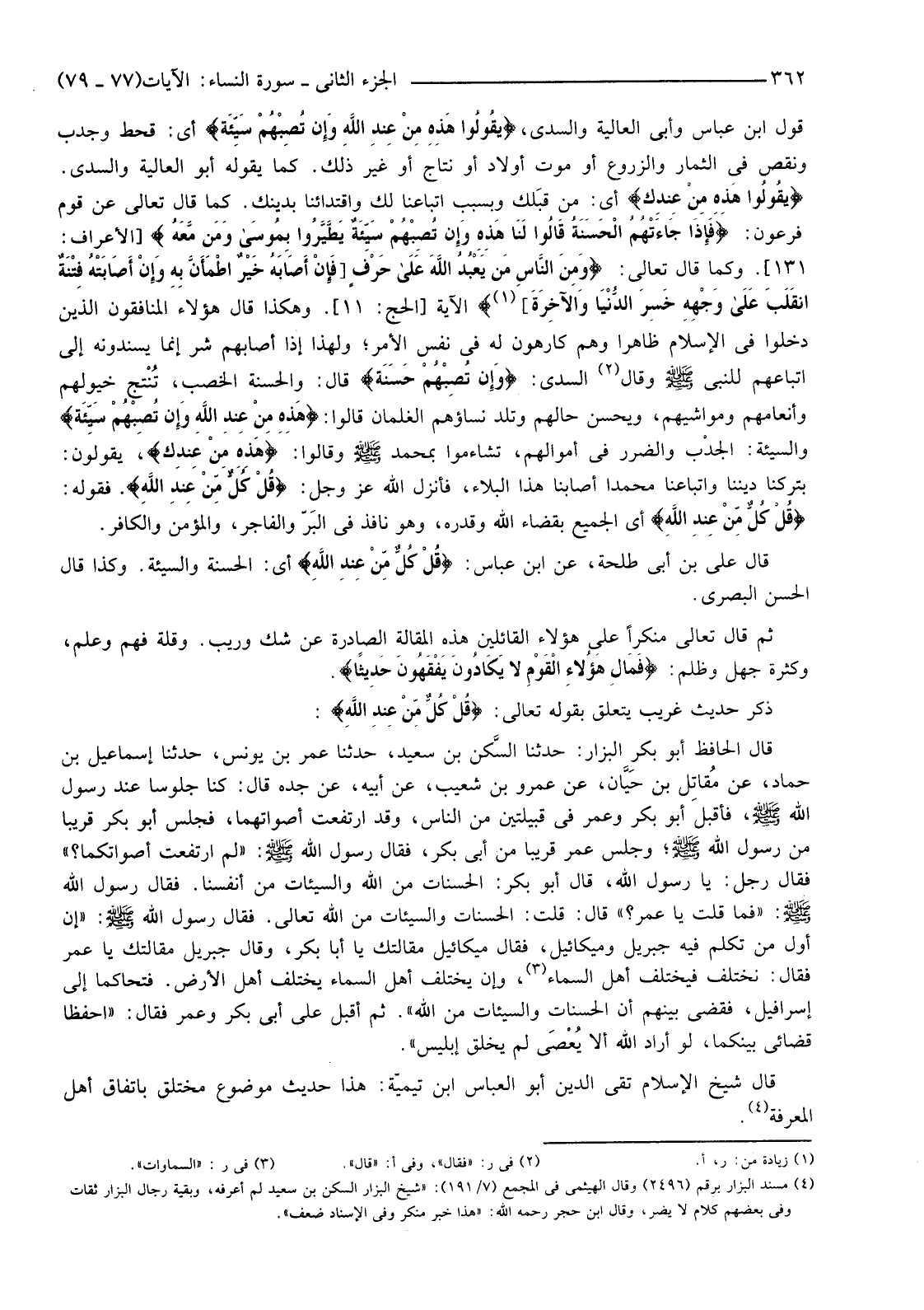 قَوْلِ ابْنِ عَبَّاسٍ وَأَبِي الْعَالِيَةِ وَالسُّدِّيِّ {يَقُولُوا هَذِهِ مِنْ عِنْدِ اللَّهِ وَإِنْ تُصِبْهُمْ سَيِّئَةٌ} أَيْ: قَحْطٌ وَجَدْبٌ وَنَقْصٌ فِي الثِّمَارِ وَالزُّرُوعِ أَوْ مَوْتُ أَوْلَادٍ أَوْ نَتَاجٍ أَوْ غَيْرِ ذَلِكَ. كَمَا يَقُولُهُ أَبُو الْعَالِيَةِ وَالسُّدِّيُّ. {يَقُولُوا هَذِهِ مِنْ عِنْدِكَ} أَيْ: مِنْ قِبَلِكَ وَبِسَبَبِ اتِّبَاعِنَا لَكَ وَاقْتِدَائِنَا بِدِينِكَ. كَمَا قَالَ تَعَالَى عَنْ قَوْمِ فِرْعَوْنَ: {فَإِذَا جَاءَتْهُمُ الْحَسَنَةُ قَالُوا لَنَا هَذِهِ وَإِنْ تُصِبْهُمْ سَيِّئَةٌ يَطَّيَّرُوا بِمُوسَى وَمَنْ مَعَهُ} [الْأَعْرَافِ: 131] وَكَمَا قَالَ تَعَالَى: {وَمِنَ النَّاسِ مَنْ يَعْبُدُ اللَّهَ عَلَى حَرْفٍ [فَإِنْ أَصَابَهُ خَيْرٌ اطْمَأَنَّ بِهِ وِإِنْ أَصَابَتْهُ فِتْنَةٌ انْقَلَبَ عَلَى وَجْهِهِ خَسِرَ الدُّنْيَا وَالآخِرَةَ] (1) } الْآيَةَ [الْحَجِّ: 11] . وَهَكَذَا قَالَ هَؤُلَاءِ الْمُنَافِقُونَ الَّذِينَ دَخَلُوا فِي الْإِسْلَامِ ظَاهِرًا وَهُمْ كَارِهُونَ لَهُ فِي نَفْسِ الْأَمْرِ؛ وَلِهَذَا إِذَا أَصَابَهُمْ شَرٌّ إِنَّمَا يَسْنُدُونَهُ إِلَى اتِّبَاعِهِمْ لِلنَّبِيِّ صَلَّى اللَّهُ عَلَيْهِ وَسَلَّمَ وَقَالَ (2) السُّدِّيُّ: {وَإِنْ تُصِبْهُمْ حَسَنَةٌ} قَالَ: وَالْحَسَنَةُ الْخِصْبُ، تُنْتج خُيُولُهُمْ وَأَنْعَامُهُمْ وَمَوَاشِيهِمْ، وَيَحْسُنُ حالهم وَتَلِدُ نِسَاؤُهُمُ الْغِلْمَانَ قَالُوا: {هَذِهِ مِنْ عِنْدِ اللَّهِ وَإِنْ تُصِبْهُمْ سَيِّئَةٌ} وَالسَّيِّئَةُ: الجدْب وَالضَّرَرُ فِي أَمْوَالِهِمْ، تَشَاءَمُوا بِمُحَمَّدٍ صَلَّى اللَّهُ عَلَيْهِ وَسَلَّمَ وَقَالُوا: {هَذِهِ مِنْ عِنْدِكَ} يَقُولُونَ: بِتَرْكِنَا ديننا وَاتِّبَاعِنَا مُحَمَّدًا أَصَابَنَا هَذَا الْبَلَاءُ، فَأَنْزَلَ اللَّهُ عَزَّ وَجَلَّ: {قُلْ كُلٌّ مِنْ عِنْدِ اللَّهِ} فَقَوْلُهُ {قُلْ كُلٌّ مِنْ عِنْدِ اللَّهِ} أَيِ الْجَمِيعُ بِقَضَاءِ اللَّهِ وَقَدَرِهِ، وَهُوَ نَافِذٌ فِي البَرّ وَالْفَاجِرِ، وَالْمُؤْمِنِ وَالْكَافِرِ.
