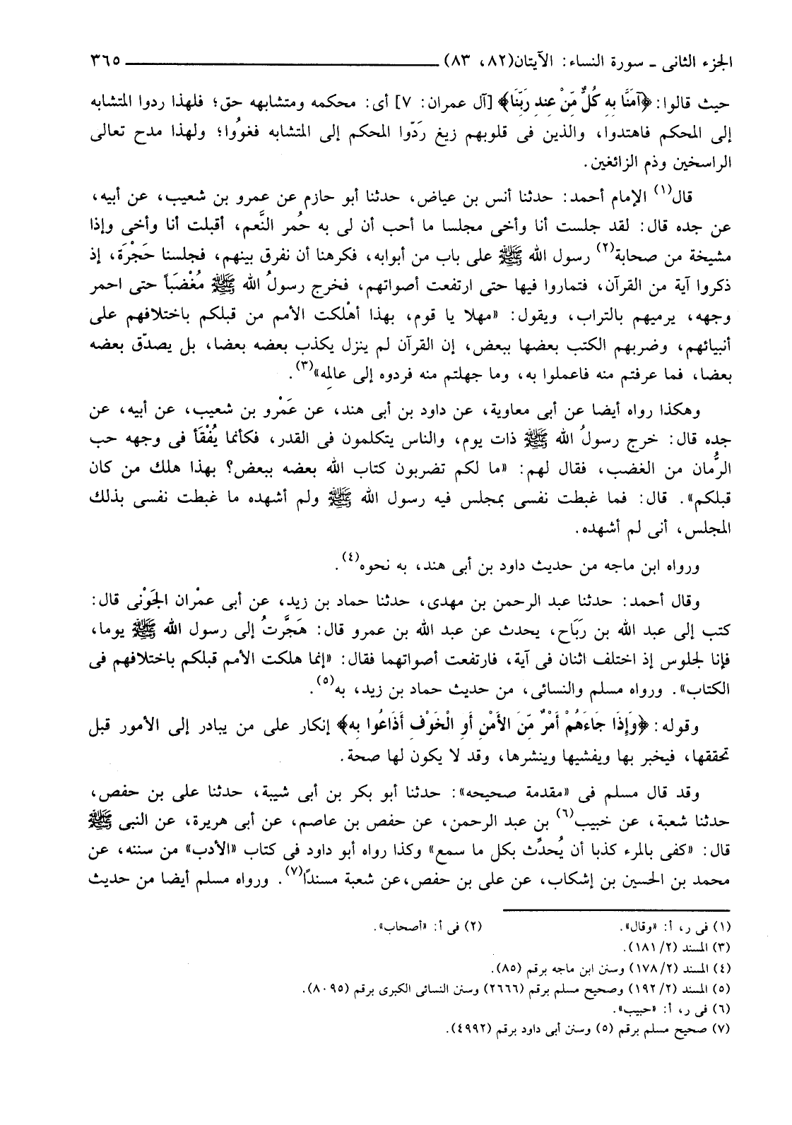 قَالَ (1) الْإِمَامُ أَحْمَدُ: حَدَّثَنَا أَنَسُ بْنُ عِيَاضٍ، حَدَّثَنَا أَبُو حَازِمٍ عَنْ عَمْرِو بْنِ شُعَيْبٍ، عَنْ أَبِيهِ، عَنْ جَدِّهِ قَالَ: لَقَدْ جَلَسْتُ أَنَا وَأَخِي مَجْلِسًا مَا أُحِبُّ أَنَّ لِي بِهِ حُمر النَّعم، أَقْبَلْتُ أَنَا وَأَخِي وَإِذَا مَشْيَخَةٌ مِنْ صَحَابَةِ (2) رَسُولِ اللَّهِ صَلَّى اللَّهُ عَلَيْهِ وَسَلَّمَ عَلَى بَابٍ مِنْ أَبْوَابِهِ، فَكَرِهْنَا أَنْ نُفَرِّقَ بَيْنَهُمْ، فَجَلَسْنَا حَجْرَة، إِذْ ذَكَرُوا آيَةً مِنَ الْقُرْآنِ، فَتَمَارَوْا فِيهَا حَتَّى ارْتَفَعَتْ أَصْوَاتُهُمْ، فَخَرَجَ رسولُ اللَّهِ صَلَّى اللَّهُ عَلَيْهِ وَسَلَّمَ مُغْضَبًا حَتَّى احْمَرَّ وَجْهُهُ، يَرْمِيهِمْ بِالتُّرَابِ، وَيَقُولُ: "مَهْلًا يَا قَوْمُ، بِهَذَا أُهْلِكَتِ الْأُمَمُ مَنْ قَبْلِكُمْ بِاخْتِلَافِهِمْ عَلَى أَنْبِيَائِهِمْ، وَضَرْبِهِمُ الْكُتُبَ بَعْضَهَا ببعض، إن القرآن لم ينزل يكذب بَعْضُهُ بَعْضًا، بَلْ يُصَدِّقُ بَعْضُهُ بَعْضًا، فَمَا عَرَفْتُمْ مِنْهُ فَاعْمَلُوا بِهِ، وَمَا جَهِلْتُمْ مِنْهُ فردوه إِلَى عالمِه" (3) .