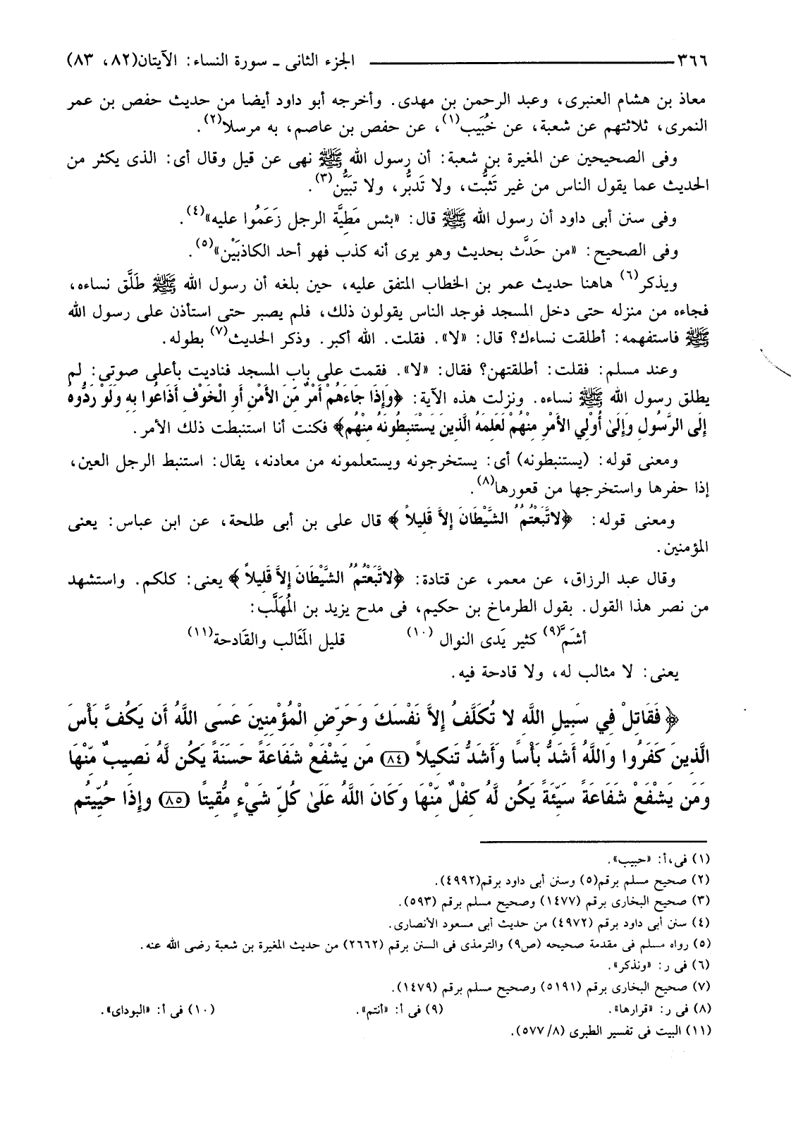 وَفِي الصَّحِيحَيْنِ عَنِ الْمُغِيرَةِ بْنِ شُعْبَةَ: أَنَّ رَسُولَ اللَّهِ صَلَّى الله عليه وسلم نَهَى عَنْ قِيلَ وَقَالَ أَيْ: الَّذِي يُكْثِرُ مِنَ الْحَدِيثِ عَمَّا يَقُولُ النَّاسُ مِنْ غَيْرِ تَثبُّت، وَلَا تَدبُّر، وَلَا تبَيُّن (3) .