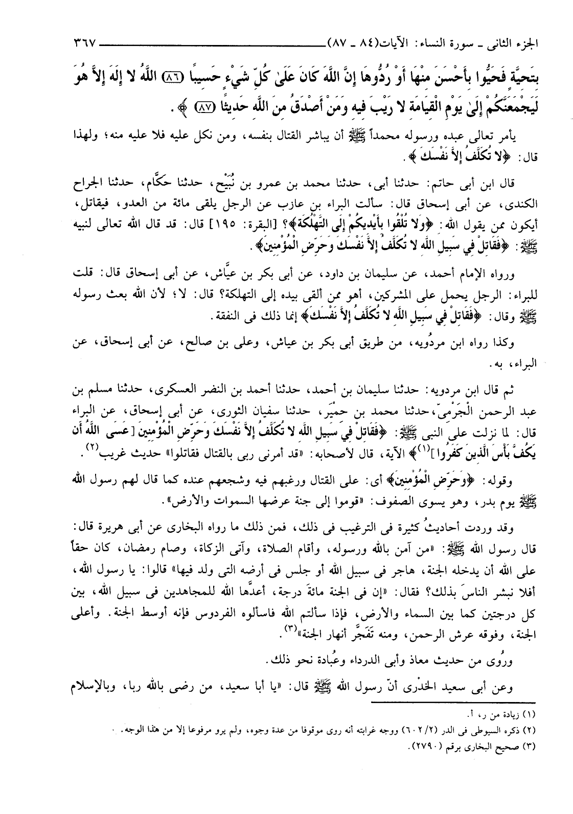 {فَقَاتِلْ فِي سَبِيلِ اللَّهِ لَا تُكَلَّفُ إِلا نَفْسَكَ وَحَرِّضِ الْمُؤْمِنِينَ عَسَى اللَّهُ أَنْ يَكُفَّ بَأْسَ الَّذِينَ كَفَرُوا وَاللَّهُ أَشَدُّ بَأْسًا وَأَشَدُّ تَنْكِيلا (84) مَنْ يَشْفَعْ شَفَاعَةً حَسَنَةً يَكُنْ لَهُ نَصِيبٌ مِنْهَا وَمَنْ يَشْفَعْ شَفَاعَةً سَيِّئَةً يَكُنْ لَهُ كِفْلٌ مِنْهَا وَكَانَ اللَّهُ عَلَى كُلِّ شَيْءٍ مُقِيتًا (85) وَإِذَا حُيِّيتُمْ بِتَحِيَّةٍ فَحَيُّوا بِأَحْسَنَ مِنْهَا أَوْ رُدُّوهَا إِنَّ اللَّهَ كَانَ عَلَى كُلِّ شَيْءٍ حَسِيبًا (86) }