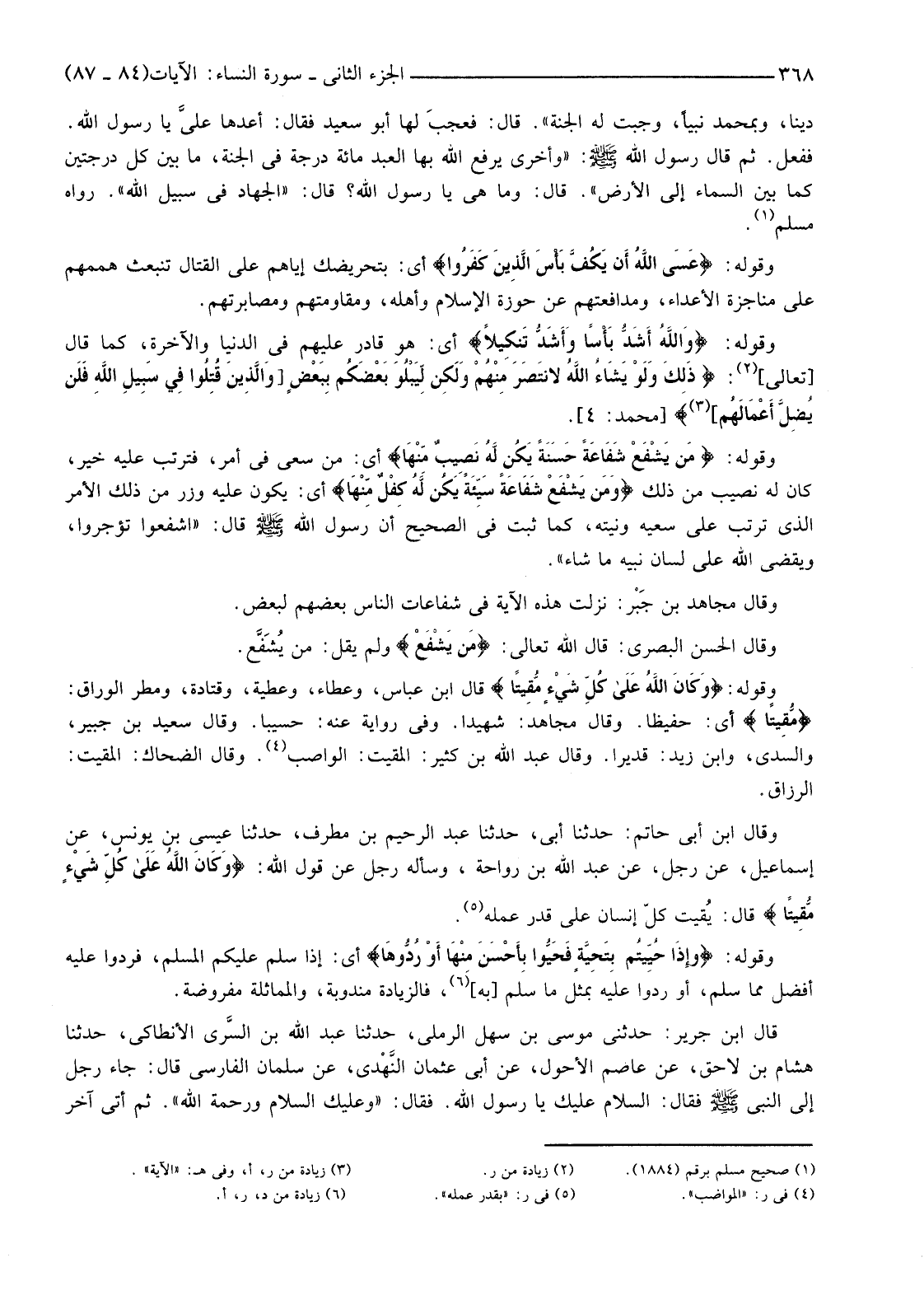 وَقَوْلُهُ: {وَكَانَ اللَّهُ عَلَى كُلِّ شَيْءٍ مُقِيتًا} قَالَ ابْنُ عَبَّاسٍ، وَعَطَاءٌ، وَعَطِيَّةُ، وَقَتَادَةُ، وَمَطَرٌ الْوَرَّاقُ: {مُقِيتًا} أَيْ: حَفِيظًا. وَقَالَ مُجَاهِدٌ: شَهِيدًا. وَفِي رِوَايَةٍ عَنْهُ: حَسِيبًا. وَقَالَ سَعِيدُ بْنُ جُبَيْرٍ، وَالسُّدِّيُّ، وَابْنُ زَيْدٍ: قَدِيرًا. وَقَالَ عَبْدُ اللَّهِ بْنُ كَثِيرٍ: الْمُقِيتُ: الْوَاصِبُ (4) وَقَالَ الضَّحَّاكُ: الْمَقِيتُ: الرَّزَّاقُ.