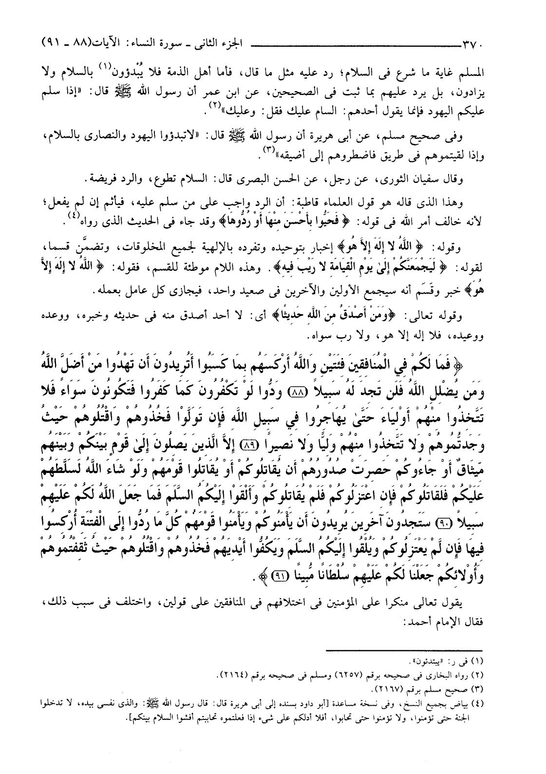 {فَمَا لَكُمْ فِي الْمُنَافِقِينَ فِئَتَيْنِ وَاللَّهُ أَرْكَسَهُمْ بِمَا كَسَبُوا أَتُرِيدُونَ أَنْ تَهْدُوا مَنْ أَضَلَّ اللَّهُ وَمَنْ يُضْلِلِ اللَّهُ فَلَنْ تَجِدَ لَهُ سَبِيلا (88) وَدُّوا لَوْ تَكْفُرُونَ كَمَا كَفَرُوا فَتَكُونُونَ سَوَاءً فَلا تَتَّخِذُوا مِنْهُمْ أَوْلِيَاءَ حَتَّى يُهَاجِرُوا فِي سَبِيلِ اللَّهِ فَإِنْ تَوَلَّوْا فَخُذُوهُمْ وَاقْتُلُوهُمْ حَيْثُ وَجَدْتُمُوهُمْ وَلا تَتَّخِذُوا مِنْهُمْ وَلِيًّا وَلا نَصِيرًا (89) إِلا الَّذِينَ يَصِلُونَ إِلَى قَوْمٍ بَيْنَكُمْ وَبَيْنَهُمْ مِيثَاقٌ أَوْ جَاءُوكُمْ حَصِرَتْ صُدُورُهُمْ أَنْ يُقَاتِلُوكُمْ أَوْ يُقَاتِلُوا قَوْمَهُمْ وَلَوْ شَاءَ اللَّهُ لَسَلَّطَهُمْ عَلَيْكُمْ فَلَقَاتَلُوكُمْ فَإِنِ اعْتَزَلُوكُمْ فَلَمْ يُقَاتِلُوكُمْ وَأَلْقَوْا إِلَيْكُمُ السَّلَمَ فَمَا جَعَلَ اللَّهُ لَكُمْ عَلَيْهِمْ سَبِيلا (90) سَتَجِدُونَ آخَرِينَ يُرِيدُونَ أَنْ يَأْمَنُوكُمْ وَيَأْمَنُوا قَوْمَهُمْ كُلَّمَا رُدُّوا إِلَى الْفِتْنَةِ أُرْكِسُوا فِيهَا فَإِنْ لَمْ يَعْتَزِلُوكُمْ وَيُلْقُوا إِلَيْكُمُ السَّلَمَ وَيَكُفُّوا أَيْدِيَهُمْ فَخُذُوهُمْ وَاقْتُلُوهُمْ حَيْثُ ثَقِفْتُمُوهُمْ وَأُولَئِكُمْ جَعَلْنَا لَكُمْ عَلَيْهِمْ سُلْطَانًا مُبِينًا (91) }
