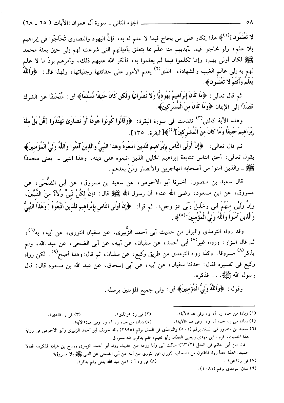 قَالَ سَعِيدُ بْنُ مَنْصُورٍ: أَخْبَرَنَا أَبُو الْأَحْوَصِ، عَنْ سَعِيدِ بْنِ مَسْرُوقٍ، عَنْ أَبِي الضُّحَى، عَنْ مَسْرُوقٍ، عَنِ ابْنِ مَسْعُودٍ، رَضِيَ اللَّهُ عَنْهُ؛ أَنَّ رَسُولَ اللَّهِ صَلَّى الله عليه وسلم قال: "إنَّ لِكُلِّ نَبِيٍّ وُلاةً مِنَ النَّبِيِّينَ، وإنَّ وَليِّي مِنْهُمْ أَبِي وخَلِيلُ رَبِّي عَزَّ وَجَلَّ". ثُمَّ قَرَأَ: {إِنَّ أَوْلَى النَّاسِ بِإِبْرَاهِيمَ لَلَّذِينَ اتَّبَعُوهُ [وَهَذَا النَّبِيُّ وَالَّذِينَ آمَنُوا وَاللَّهُ وَلِيُّ الْمُؤْمِنِينَ] (4) } .