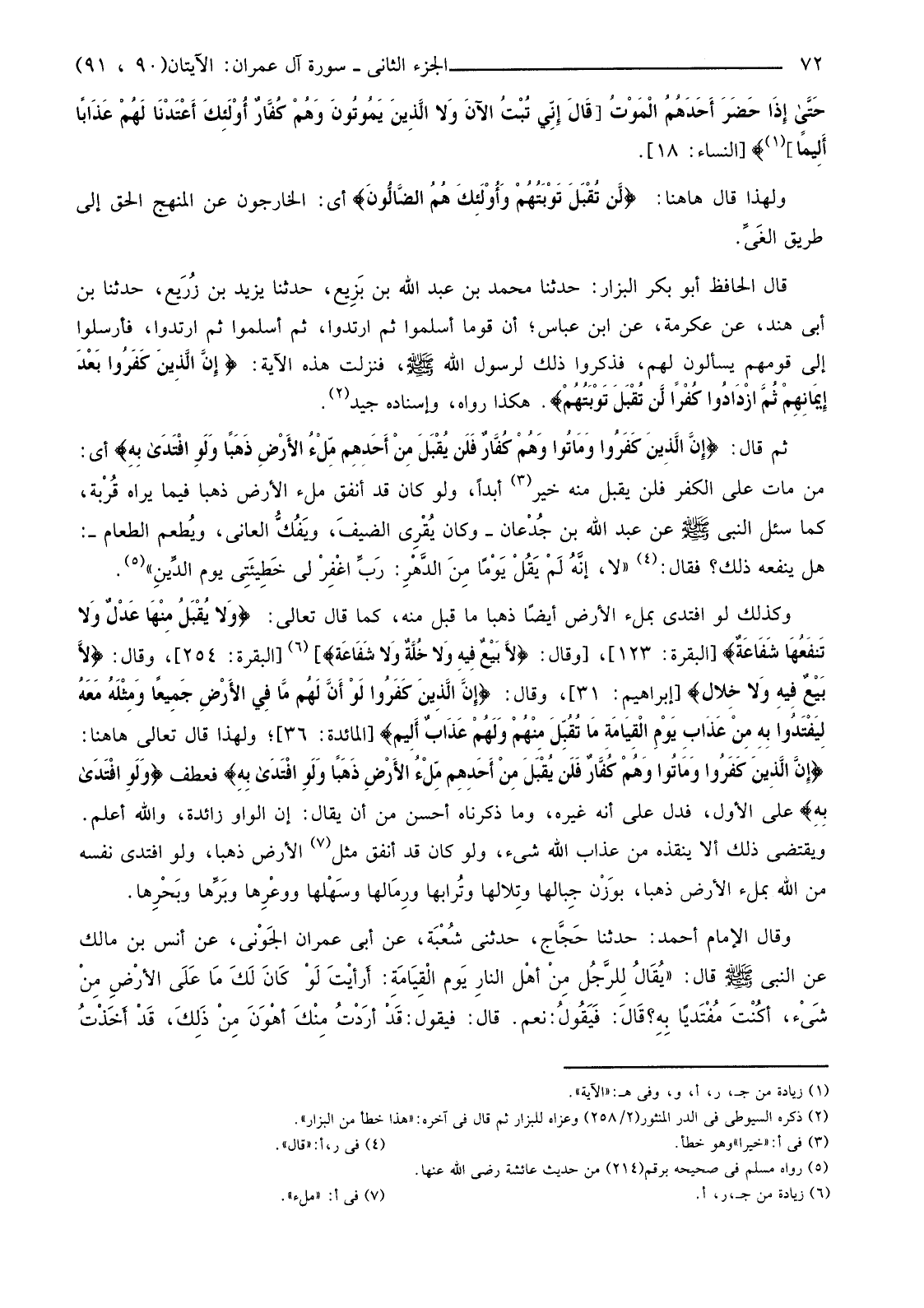 وَكَذَلِكَ لَوِ افْتَدَى بِمِلْءِ الْأَرْضِ أَيْضًا ذَهَبًا مَا قُبِلَ مِنْهُ، كَمَا قَالَ تَعَالَى: {وَلا يُقْبَلُ مِنْهَا عَدْلٌ وَلا تَنْفَعُهَا شَفَاعَةٌ} [الْبَقَرَةِ:123] ، [وَقَالَ {لَا بَيْعٌ فِيهِ وَلا خُلَّةٌ وَلا شَفَاعَةٌ} ] (5) [الْبَقَرَةِ:254] وَقَالَ: {لَا بَيْعٌ فِيهِ وَلا خِلالٌ} [إِبْرَاهِيمَ: 31] وَقَالَ {إِنَّ الَّذِينَ كَفَرُوا لَوْ أَنَّ لَهُمْ مَا فِي الأرْضِ جَمِيعًا وَمِثْلَهُ مَعَهُ لِيَفْتَدُوا بِهِ مِنْ عَذَابِ يَوْمِ الْقِيَامَةِ مَا تُقُبِّلَ مِنْهُمْ وَلَهُمْ عَذَابٌ أَلِيمٌ} [الْمَائِدَةِ:36] ؛ وَلِهَذَا قَالَ تَعَالَى هَاهُنَا: {إِنَّ الَّذِينَ كَفَرُوا وَمَاتُوا وَهُمْ كُفَّارٌ فَلَنْ يُقْبَلَ مِنْ أَحَدِهِمْ مِلْءُ الأرْضِ ذَهَبًا وَلَوِ افْتَدَى بِهِ} فَعَطَفَ {وَلَوِ افْتَدَى بِهِ} عَلَى الْأَوَّلِ، فَدَلَّ عَلَى أَنَّهُ غَيْرُهُ، وَمَا ذَكَرْنَاهُ أَحْسَنُ مِنْ أَنْ يُقَالَ: إِنَّ الْوَاوَ زَائِدَةٌ، وَاللَّهُ أَعْلَمُ. وَيَقْتَضِي ذَلِكَ أَلَّا يُنْقِذَهُ مِنْ عَذَابِ اللَّهِ شَيْءٌ، وَلَوْ كَانَ قَدْ أَنْفَقَ مِثْلَ (6) الْأَرْضِ ذَهَبَا، وَلَوِ افْتَدَى نَفْسَهُ مِنَ اللَّهِ بِمِلْءِ الْأَرْضِ ذَهَبَا، بوَزْن جِبالها وتِلالها وتُرابها ورِمَالها وسَهْلها ووعْرِها وبَرِّها وبَحْرِها.