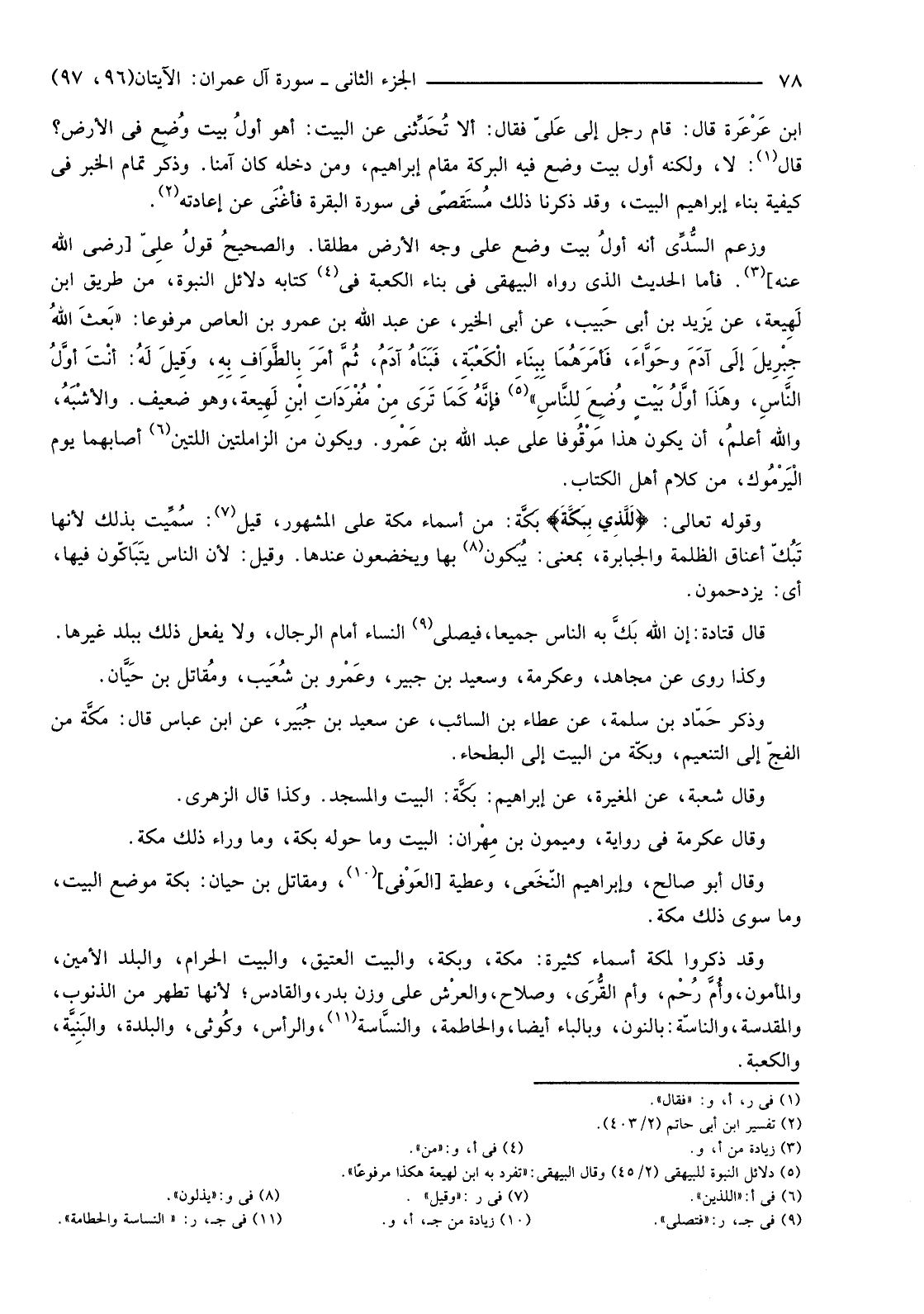 ابن عَرْعَرة قَالَ: قَامَ رَجُلٌ إِلَى عَليّ فَقَالَ: أَلَا تُحَدِّثني عَنِ الْبَيْتِ: أَهْوَ أولُ بَيْتٍ وُضِع فِي الْأَرْضِ؟ قَالَ (1) لَا وَلَكِنَّهُ أَوَّلُ بَيْتٍ وُضِعَ فِيهِ الْبَرَكَةُ مَقَامُ إِبْرَاهِيمَ، وَمَنْ دَخَلَهُ كَانَ آمِنًا. وَذَكَرَ تَمَامَ الْخَبَرِ فِي كَيْفِيَّةِ بِنَاءِ إِبْرَاهِيمَ الْبَيْتَ، وَقَدْ ذَكَرْنَا ذَلِكَ مُستَقصًى فِي سُورَةِ الْبَقَرَةِ فأغْنَى عَنْ إِعَادَتِهِ (2) .