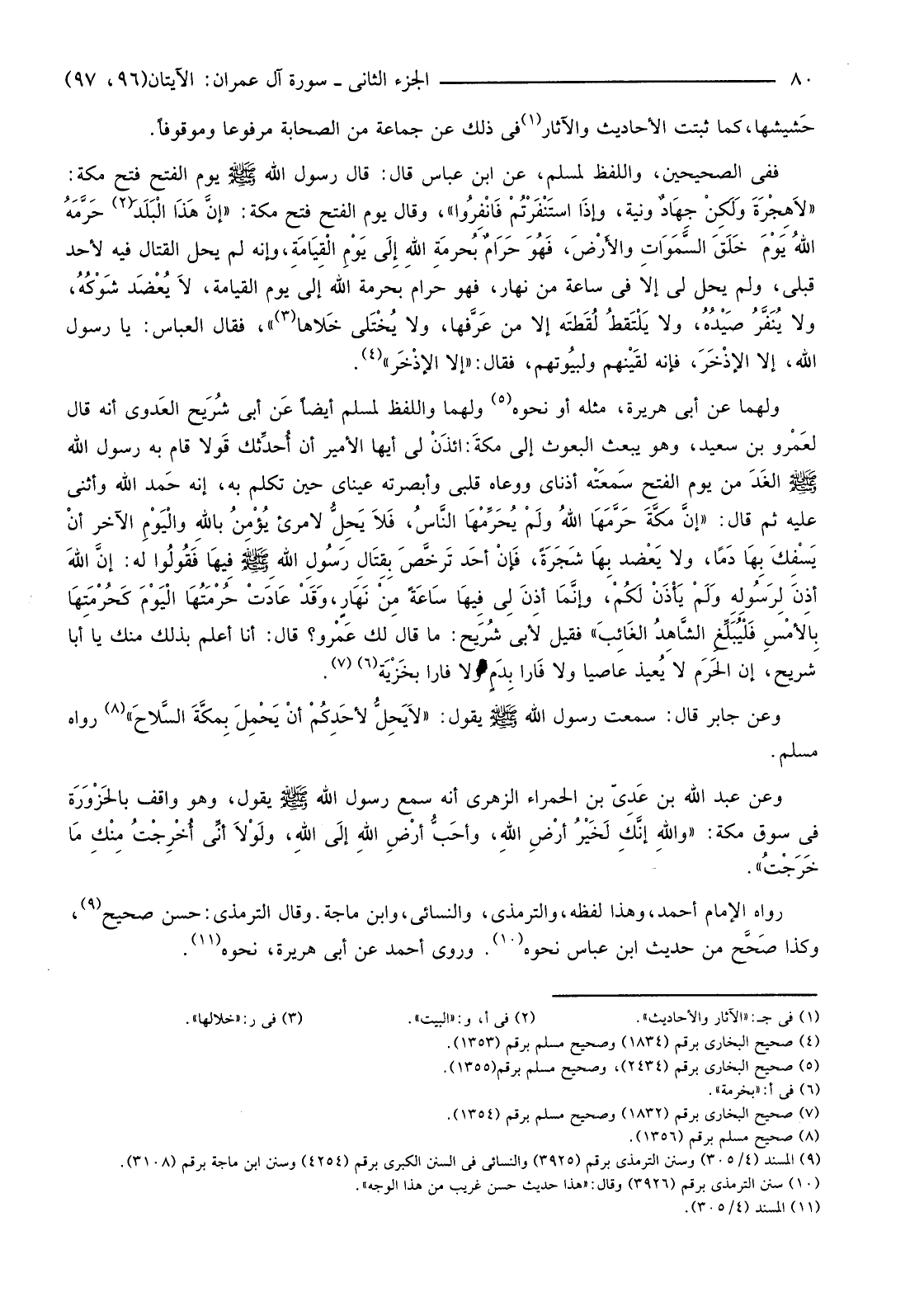 فَفِي الصَّحِيحَيْنِ، وَاللَّفْظُ لِمُسْلِمٍ، عَنِ ابْنِ عَبَّاسٍ قَالَ: قَالَ رَسُولُ اللَّهِ صَلَّى اللَّهُ عَلَيْهِ وَسَلَّمَ يَوْمَ الْفَتْحِ فَتْحِ مَكَّةَ: "لَا هِجْرَةَ وَلَكِنْ جِهَادٌ وَنِيَّةٌ، وإذَا استَنْفَرْتُمْ فَانْفِرُوا"، وَقَالَ يَوْمَ الْفَتْحِ فَتْحِ مَكَّةَ: "إنَّ هَذَا الْبَلَدَ (2) حَرَّمَهُ اللهُ يَوْمَ خَلَقَ السَّمَوَاتِ والأرْضَ، فَهُوَ حَرَامٌ بِحرمَةِ اللَّهِ إِلَى يَوْمِ الْقِيَامَةِ، وَإِنَّهُ لَمْ يَحِلَّ الْقِتَالُ فِيهِ لِأَحَدٍ قَبْلِي، وَلَمْ يَحِلَّ لِي إِلَّا فِي سَاعَةٍ مِنْ نَهَارٍ، فَهُوَ حَرَامٌ بِحُرْمَةِ اللَّهِ إِلَى يَوْمِ الْقِيَامَةِ، لَا يُعْضَد شَوْكُهُ، وَلَا يُنَفَّرُ صَيْدُهُ، وَلَا يَلْتَقطْ لُقَطتَه إِلَّا مَنْ عَرَّفها، وَلَا يُخْتَلى خَلاها (3) فقال العباس: يا رسول الله، إلا الإذْخَرَ، فَإِنَّهُ لقَيْنهم ولبُيوتهم، فَقَالَ: "إِلَّا الإذْخَر" (4) .