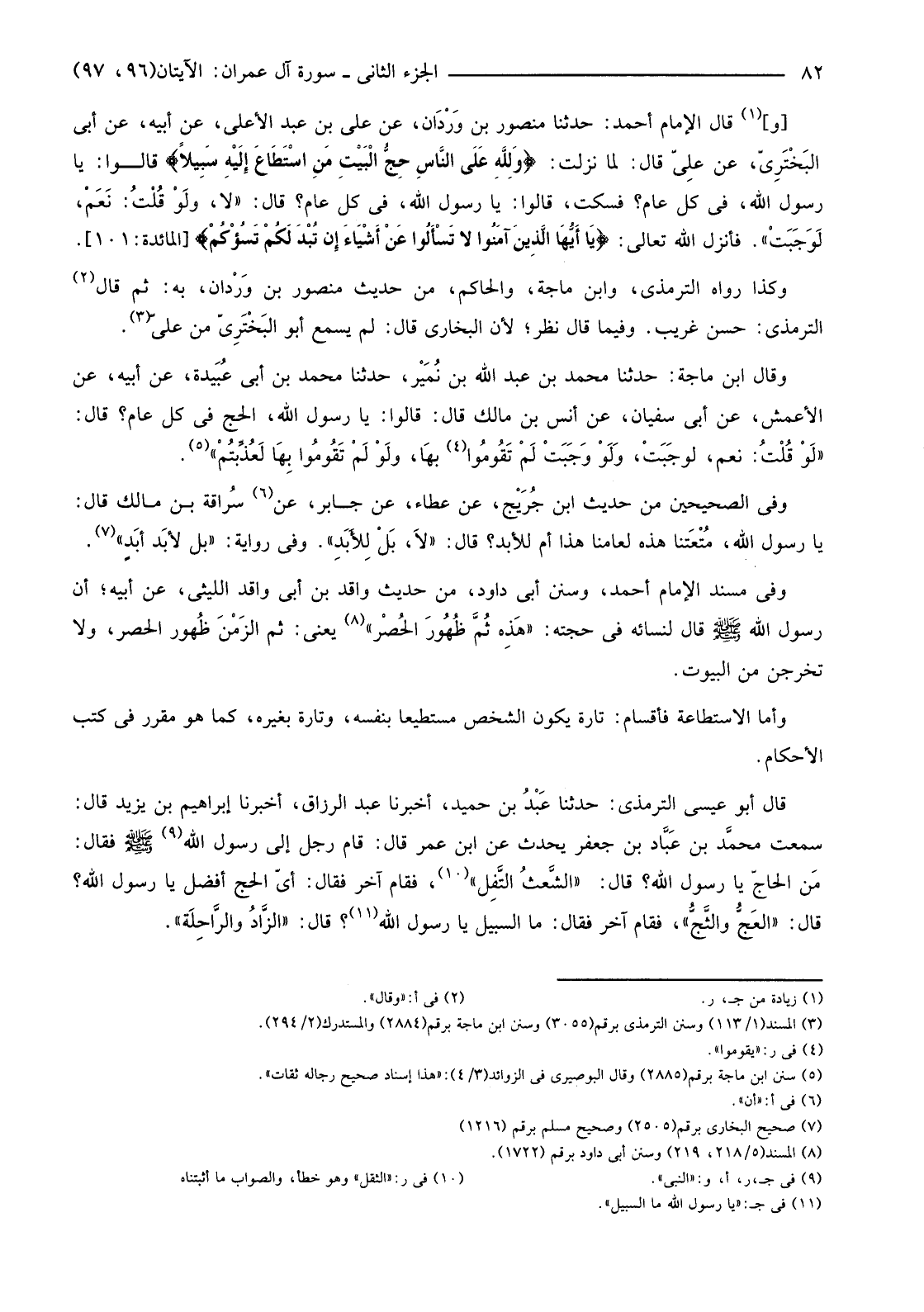 قَالَ أَبُو عِيسَى التِّرْمِذِيُّ: حَدَّثَنَا عَبْدُ بْنُ حُمَيْدٍ، أَخْبَرَنَا عَبْدُ الرَّزَّاقِ، أَخْبَرَنَا إِبْرَاهِيمُ بْنُ يَزِيدَ قَالَ: سَمِعْتُ محمَّد بْنَ عَبَّاد بْنِ جَعْفَرٍ يُحَدِّثُ عَنِ ابْنِ عُمَرَ قَالَ: قَامَ رَجُلٌ إِلَى رَسُولِ اللَّهِ (9) صَلَّى اللَّهُ عَلَيْهِ وسلم فَقَالَ: مَن الْحَاجُّ يَا رَسُولَ اللَّهِ؟ قَالَ: "الشَّعثُ التَّفِل" (10) فَقَامَ آخَرُ فَقَالَ: أَيُّ الْحَجِّ أَفْضَلُ يَا رَسُولَ اللَّهِ؟ قَالَ: "العَجُّ والثَّجُّ"، فَقَامَ آخَرُ فَقَالَ: مَا السَّبِيلُ يَا رَسُولَ الله (11) ؟ قال: "الزَّادُ والرَّاحِلَة".