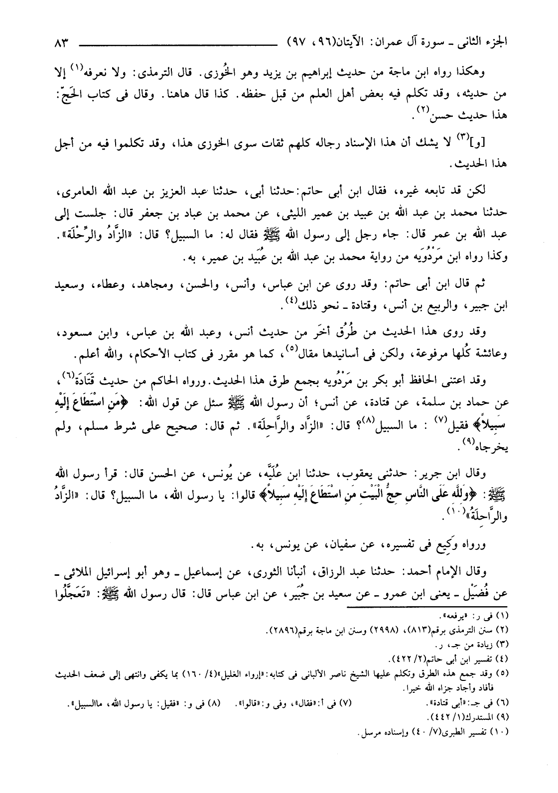 وَقَدِ اعْتَنَى الْحَافِظُ أَبُو بَكْرِ بْنُ مَرْدُويه بِجَمْعِ طُرُقِ هَذَا الْحَدِيثِ. وَرَوَاهُ الْحَاكِمُ مِنْ حَدِيثِ قَتَادَة (6) عَنْ حَمَّادِ بْنِ سَلَمَةَ، عَنْ قَتَادَةَ، عَنْ أَنَسٍ؛ أَنَّ رَسُولَ اللَّهِ صَلَّى اللَّهُ عَلَيْهِ وَسَلَّمَ سُئِلَ عَنْ قَوْلِ اللَّهِ: {مَنِ اسْتَطَاعَ إِلَيْهِ سَبِيلا} فَقِيلَ (7) مَا السَّبِيلُ (8) ؟ قَالَ: "الزَّاد والرَّاحِلَة". ثُمَّ قَالَ: صَحِيحٌ عَلَى شَرْطِ مُسْلِمٍ، وَلَمْ يُخَرِّجَاهُ (9) .
