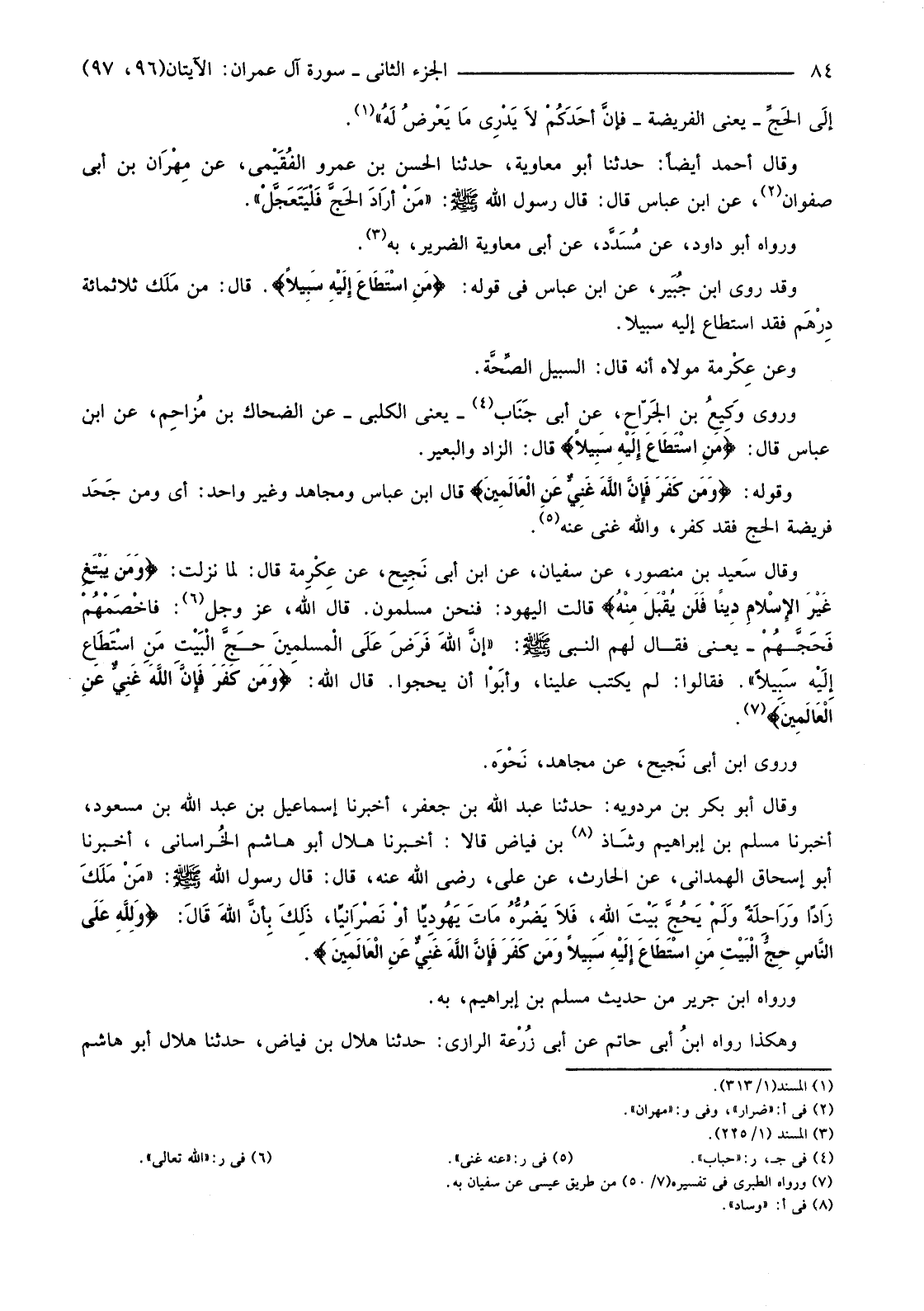 وَقَالَ أَبُو بَكْرِ بْنُ مَرْدَوَيْهِ: حَدَّثَنَا عَبْدُ اللَّهِ بْنُ جَعْفَرٍ، أَخْبَرَنَا إِسْمَاعِيلُ بْنُ عَبْدِ اللَّهِ بْنِ مَسْعُودٍ، أَخْبَرَنَا مُسْلِمُ بْنُ إِبْرَاهِيمَ وشَاذ (8) بْنُ فَيَّاضٍ قَالَا أَخْبَرَنَا هِلَالٌ أَبُو هَاشِمٍ الخُراساني، أَخْبَرَنَا أَبُو إِسْحَاقَ الْهَمْدَانِيُّ، عَنِ الْحَارِثِ، عَنْ عَلِيٍّ، رَضِيَ اللَّهُ عَنْهُ، قَالَ: قَالَ رَسُولُ اللَّهِ صَلَّى اللَّهُ عَلَيْهِ وَسَلَّمَ: "مَنْ مَلَكَ زَادًا وَرَاحِلَةً وَلَمْ يَحُجَّ بَيْتَ اللهِ، فَلا يَضُرُّهُ مَاتَ يَهُودِيّا أوْ نَصْرانِيّا، ذَلِكَ بِأنَّ اللهَ قَالَ: {وَلِلَّهِ عَلَى النَّاسِ حِجُّ الْبَيْتِ مَنِ اسْتَطَاعَ إِلَيْهِ سَبِيلا وَمَنْ كَفَرَ فَإِنَّ اللَّهَ غَنِيٌّ عَنِ الْعَالَمِينَ} .