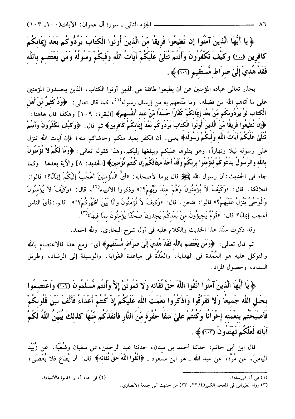 يُحَذِّرُ تَعَالَى عِبَادَهُ الْمُؤْمِنِينَ عَنْ أَنْ يُطِيعُوا طَائِفَةً مِنَ الَّذِينَ أُوتُوا الْكِتَابَ، الَّذِينَ يَحْسُدُونَ الْمُؤْمِنِينَ عَلَى مَا آتَاهُمُ اللَّهُ مِنْ فَضْلِهِ، وَمَا مَنَحهم بِهِ مِنْ إِرْسَالِ رَسُولِهِ (1) كَمَا قَالَ تَعَالَى: {وَدَّ كَثِيرٌ مِنْ أَهْلِ الْكِتَابِ لَوْ يَرُدُّونَكُمْ مِنْ بَعْدِ إِيمَانِكُمْ كُفَّارًا حَسَدًا مِنْ عِنْدِ أَنْفُسِهِمْ} [الْبَقَرَةِ:109] وَهَكَذَا قَالَ هَاهُنَا: {إِنْ تُطِيعُوا فَرِيقًا مِنَ الَّذِينَ أُوتُوا الْكِتَابَ يَرُدُّوكُمْ بَعْدَ إِيمَانِكُمْ كَافِرِينَ} ثُمَّ قَالَ {وَكَيْفَ تَكْفُرُونَ وَأَنْتُمْ تُتْلَى عَلَيْكُمْ آيَاتُ اللَّهِ وَفِيكُمْ رَسُولُهُ} يَعْنِي: أَنَّ الْكُفْرَ بَعِيدٌ مِنْكُمْ وَحَاشَاكُمْ مِنْهُ؛ فَإِنَّ آيَاتِ اللَّهِ تَنْزِلُ عَلَى رَسُولِهِ لَيْلًا وَنَهَارًا، وَهُوَ يَتْلُوهَا عَلَيْكُمْ وَيُبَلِّغُهَا إِلَيْكُمْ، وَهَذَا كَقَوْلِهِ تَعَالَى: {وَمَا لَكُمْ لَا تُؤْمِنُونَ بِاللَّهِ وَالرَّسُولُ يَدْعُوكُمْ لِتُؤْمِنُوا بِرَبِّكُمْ وَقَدْ أَخَذَ مِيثَاقَكُمْ إِنْ كُنْتُمْ مُؤْمِنِينَ} [الْحَدِيدِ:8] وَالْآيَةِ بَعْدَهَا. وَكَمَا جَاءَ فِي الْحَدِيثِ: أَنَّ رَسُولَ اللَّهِ صَلَّى اللَّهُ عَلَيْهِ وَسَلَّمَ قَالَ يَوْمًا لِأَصْحَابِهِ: "أيُّ الْمُؤمِنِينَ أعْجَبُ إلَيْكُمْ إيمَانًا؟ " قَالُوا: الْمَلَائِكَةُ. قَالَ: "وَكَيْفَ لَا يُؤْمِنُونَ وَهُمْ عِنْدَ رَبِّهِمْ؟! " وَذَكَرُوا الْأَنْبِيَاءَ (2) قَالَ: "وَكَيْفَ لَا يُؤْمِنُونَ وَالْوَحْيُ يَنزلُ عَلَيْهِمْ؟ " قَالُوا: فَنَحْنُ. قَالَ: "وَكَيْفَ لَا تُؤْمِنُونَ وأنَا بَيْنَ أظْهُرِكُمْ؟! ". قَالُوا: فَأَيُّ النَّاسِ أَعْجَبُ إِيمَانًا؟ قَالَ: "قَوْمٌ يَجِيؤُونَ مِنْ بَعْدِكُمْ يَجِدونَ صُحُفًا يُؤْمِنُونَ بِمَا فِيهَا" (3) . وَقَدْ ذَكَرْتُ سَنَد هَذَا الْحَدِيثِ وَالْكَلَامَ عَلَيْهِ فِي أَوَّلِ شَرْحِ الْبُخَارِيِّ، وَلِلَّهِ الْحَمْدُ.