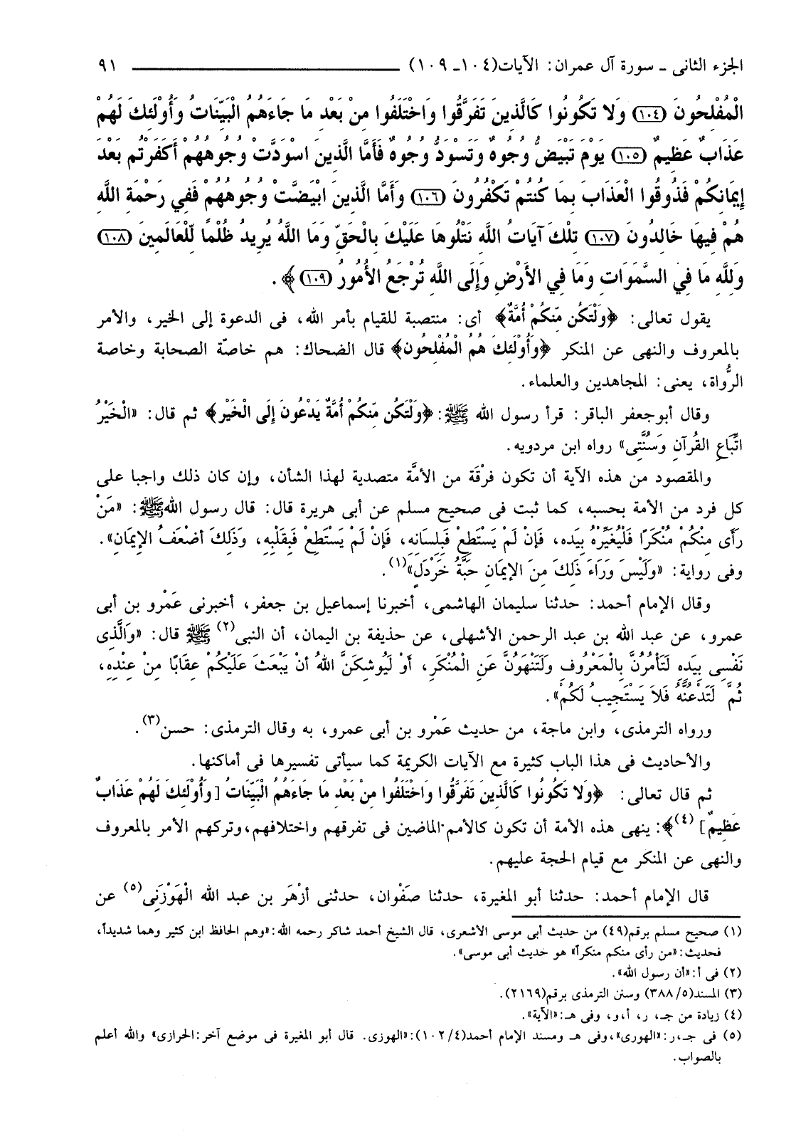 وَالْمَقْصُودُ مِنْ هَذِهِ الْآيَةِ أَنْ تَكُونَ فرْقَة مِنَ الأمَّة مُتَصَدِّيَةٌ لِهَذَا الشَّأْنِ، وَإِنْ كَانَ ذَلِكَ وَاجِبًا عَلَى كُلِّ فَرْدٍ مِنَ الْأُمَّةِ بِحَسْبِهِ، كَمَا ثَبَتَ فِي صَحِيحِ مُسْلِمٍ عَنْ أَبِي هُرَيْرَةَ قَالَ: قَالَ رَسُولُ اللَّهِ صَلَّى اللَّهُ عَلَيْهِ وَسَلَّمَ: "مَنْ رَأَى مِنْكُمْ مُنْكَرًا فَلْيُغَيِّرْهُ بِيَده، فَإنْ لَمْ يَسْتَطِعْ فَبِلِسَانِهِ، فَإنْ لَمْ يَسْتَطِعْ فَبِقَلْبِهِ، وَذَلِكَ أضْعَفُ الإيمَانِ". وَفِي رِوَايَةٍ: "وَلَيْسَ وَرَاءَ ذَلِكَ مِنَ الإيمَانِ حَبَّةُ خَرْدَلٍ" (1) .