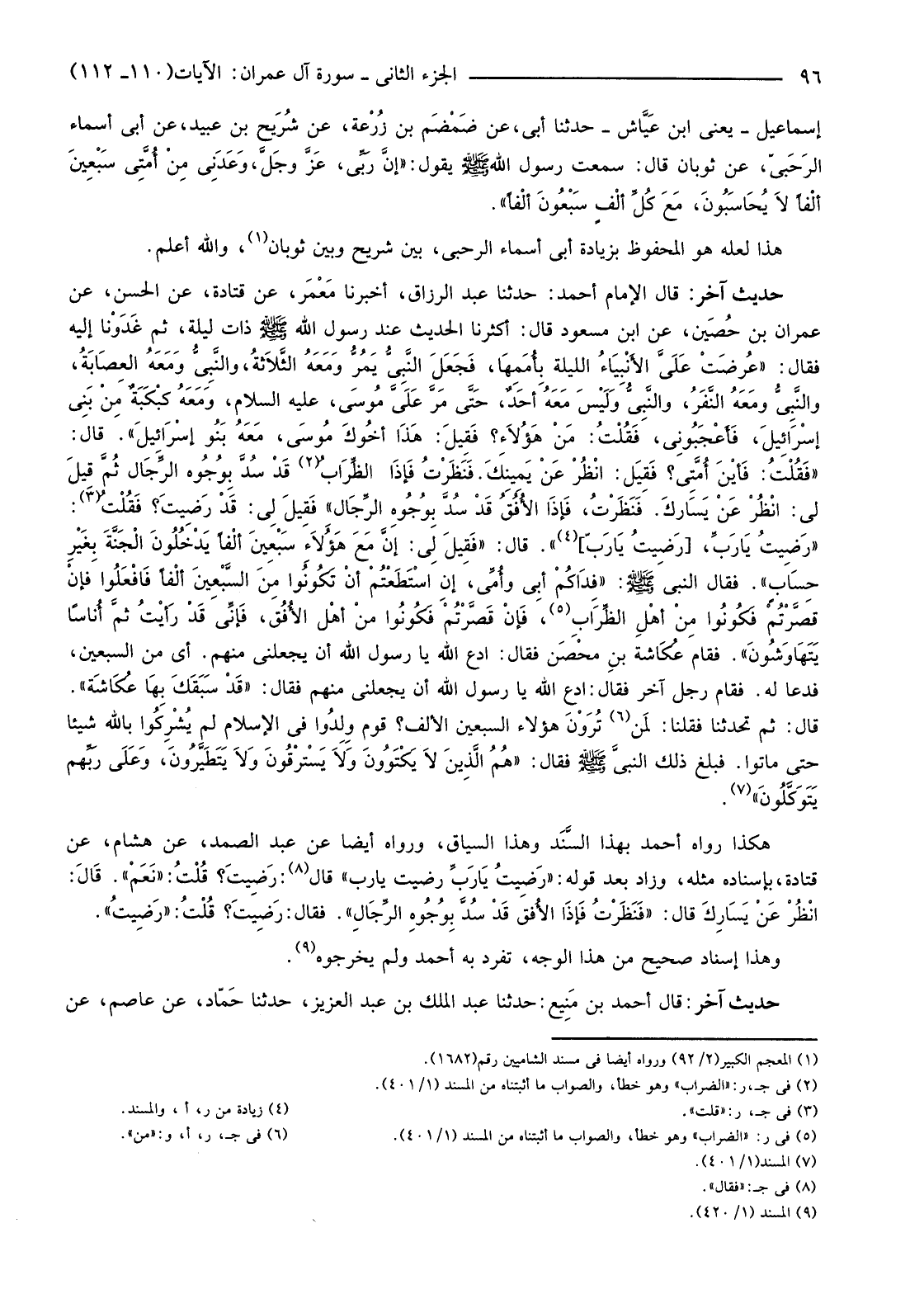 حَدِيثٌ آخَرُ: قَالَ الْإِمَامُ أَحْمَدُ: حَدَّثَنَا عَبْدُ الرَّزَّاقِ، أَخْبَرَنَا مَعْمر، عن قَتَادَةَ، عَنِ الْحَسَنِ، عَنْ عِمْرَانَ بْنِ حُصَين، عَنِ ابْنِ مَسْعُودٍ قَالَ: أَكْثَرْنَا الْحَدِيثَ عِنْدَ رَسُولِ اللَّهِ صَلَّى اللَّهُ عَلَيْهِ وَسَلَّمَ ذات لَيْلَةٍ، ثُمَّ غَدَوْنا إِلَيْهِ فَقَالَ: "عُرِضَتْ عَلَيَّ الأنْبِيَاءُ اللَّيْلَةَ بِأُمَمِهَا، فَجَعَلَ النَّبِيُّ يَمُرُّ وَمَعَهُ الثَّلاثَةُ، وَالنَّبِيُّ وَمَعَهُ الْعِصَابَةُ، وَالنَّبِيُّ وَمَعَهُ النَّفَرُ، وَالنَّبِيُّ لَيْسَ مَعَهُ أَحَدٌ، حَتَّى مَرَّ عَلَيَّ مُوسَى، عَلَيْهِ السَّلَامُ، ومَعَهُ كَبْكَبَةٌ مِنْ بَنِي إِسْرَائِيلَ، فَأَعْجَبُونِي، فَقُلْتُ: مَنْ هَؤُلاءِ؟ فَقِيلَ لِي: هَذَا أَخُوكَ مُوسَى، مَعَهُ بَنُو إِسْرَائِيلَ". قَالَ: "قُلْتُ: فَأَيْنَ أُمَّتِي؟ فَقِيلَ: انْظُرْ عَنْ يَمِينِكَ. فَنَظَرْتُ فَإِذَا الظِّرَابُ (2) قَدْ سُدَّ بِوُجُوهِ الرِّجَالِ ثُمَّ قِيلَ لِي انْظُرْ عَنْ يَسَارِكَ فَنَظَرْتُ فَإِذَا الأفُقُ قَدْ سُدَّ بِوُجُوهِ الرِّجَالِ فَقِيلَ لِي: قَدْ رَضِيتَ؟ فَقُلْتُ (3) "رَضِيتُ يَا رَبِّ، [رَضِيتُ يَا رَبِّ] (4) " قَالَ: "فَقِيلَ لِي: إِنَّ مَعَ هَؤُلاءِ سَبْعِينَ أَلْفًا يَدْخُلُونَ الْجَنَّةَ بِغَيْرِ حِسَابٍ". فَقَالَ النَّبِيُّ صَلَّى اللَّهُ عَلَيْهِ وَسَلَّمَ: "فِدَاكُمْ أَبِي وَأُمِّي إِنِ اسْتَطَعْتُمْ أَنْ تَكُونُوا مِنْ السَّبْعِينَ أَلْفًا فَافْعَلُوا فَإِنْ قَصَّرْتُمْ فَكُونُوا مِنْ أَهْلِ الظِّرَابِ (5) فَإِنْ قَصَّرْتُمْ فَكُونُوا مِنْ أَهْلِ الأفُقِ، فَإِنِّي قَدْ رَأَيْتُ ثَمَّ أُناسًا يَتَهَاوَشُونَ". فَقَامَ عُكاشَةُ بْنُ مِحْصَنٍ فَقَالَ: ادْعُ اللَّهَ يَا رَسُولَ اللَّهِ أَنْ يَجْعَلَنِي مِنْهُمْ. أَيْ مِنَ السَّبْعِينَ، فَدَعَا لَهُ. فَقَامَ رَجُلٌ آخَرُ فَقَالَ: ادْعُ اللَّهَ يَا رَسُولَ اللَّهِ أَنْ يَجْعَلَنِي مِنْهُمْ فَقَالَ: "قَدْ سَبَقَكَ بِهَا عُكاشَة". قَالَ: ثُمَّ تَحَدَّثْنَا فَقُلْنَا: لمَنْ (6) تُرَوْنَ هَؤُلَاءِ السَّبْعِينَ الْأَلْفَ؟ قَوْمٌ وُلِدُوا فِي الْإِسْلَامِ لَمْ يُشْرِكُوا بِاللَّهِ شَيْئًا حَتَّى مَاتُوا. فَبَلَغَ ذَلِكَ النَّبِيَّ صَلَّى اللَّهُ عَلَيْهِ وَسَلَّمَ فَقَالَ: "هُمْ الَّذِينَ لَا يَكْتَوُونَ وَلا يَسْتَرْقُونَ وَلا يَتَطَيَّرُونَ، وَعَلَى رَبِّهِمْ يَتَوَكَّلُونَ" (7) .