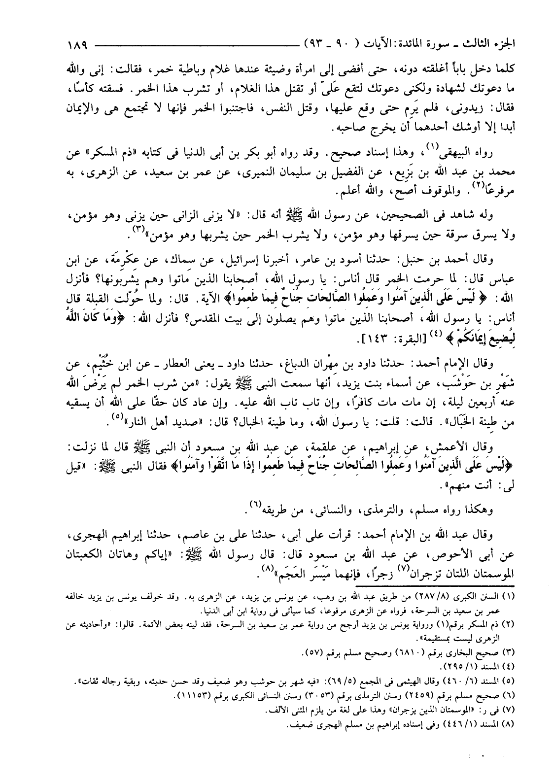 (2) ذم المسكر برقم (1) ورواية يونس بن يزيد أرجح من رواية عمر بن سعيد بن السرحة، فقد لينه بعض الأئمة. قالوا: "وأحاديثه عن الزهري ليست بمستقيمة".