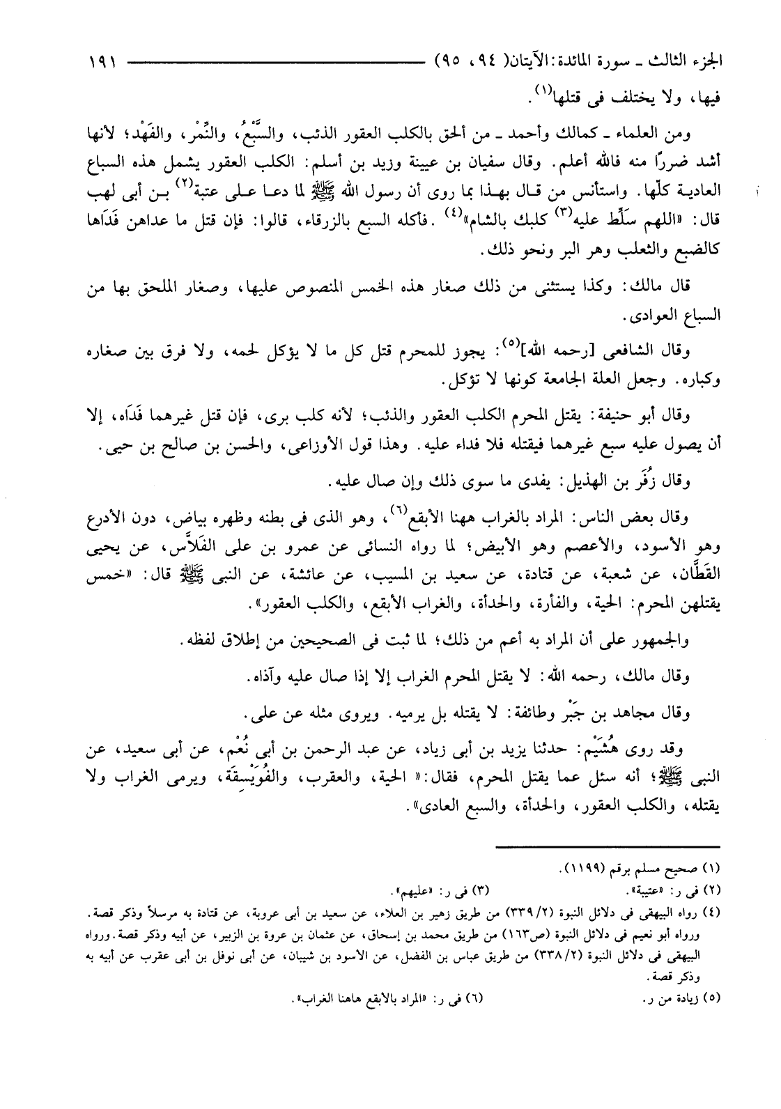 وَمِنَ الْعُلَمَاءِ -كَمَالِكٍ وَأَحْمَدَ-مَنْ أَلْحَقَ بِالْكَلْبِ الْعَقُورِ الذِّئْبَ، والسَّبْعُ، والنِّمْر، والفَهْد؛ لِأَنَّهَا أَشَدُّ ضَرَرًا مِنْهُ فَاللَّهُ أَعْلَمُ. وَقَالَ سُفْيَانُ بْنُ عُيَيْنَةَ وَزَيْدُ بْنُ أَسْلَمَ: الْكَلْبُ الْعَقُورُ يَشْمَلُ هَذِهِ السِّبَاعَ الْعَادِيَةَ كُلَّهَا. وَاسْتَأْنَسَ مَنْ قَالَ بِهَذَا بِمَا رُوِيَ أَنَّ رَسُولَ اللَّهِ صَلَّى اللَّهُ عَلَيْهِ وَسَلَّمَ لَمَّا دَعَا عَلَى عُتْبَةَ (2) بْنِ أَبِي لَهَبٍ قَالَ: "اللَّهُمَّ سَلِّط عَلَيْهِ (3) كَلْبَكَ بِالشَّامِ" (4) فَأَكَلَهُ السَّبُعُ بِالزَّرْقَاءِ، قَالُوا: فَإِنْ قَتَلَ مَا عَدَاهُنَّ فَدَاها كَالضَّبُعِ وَالثَّعْلَبِ وَهِرِّ الْبَرِّ وَنَحْوِ ذَلِكَ.