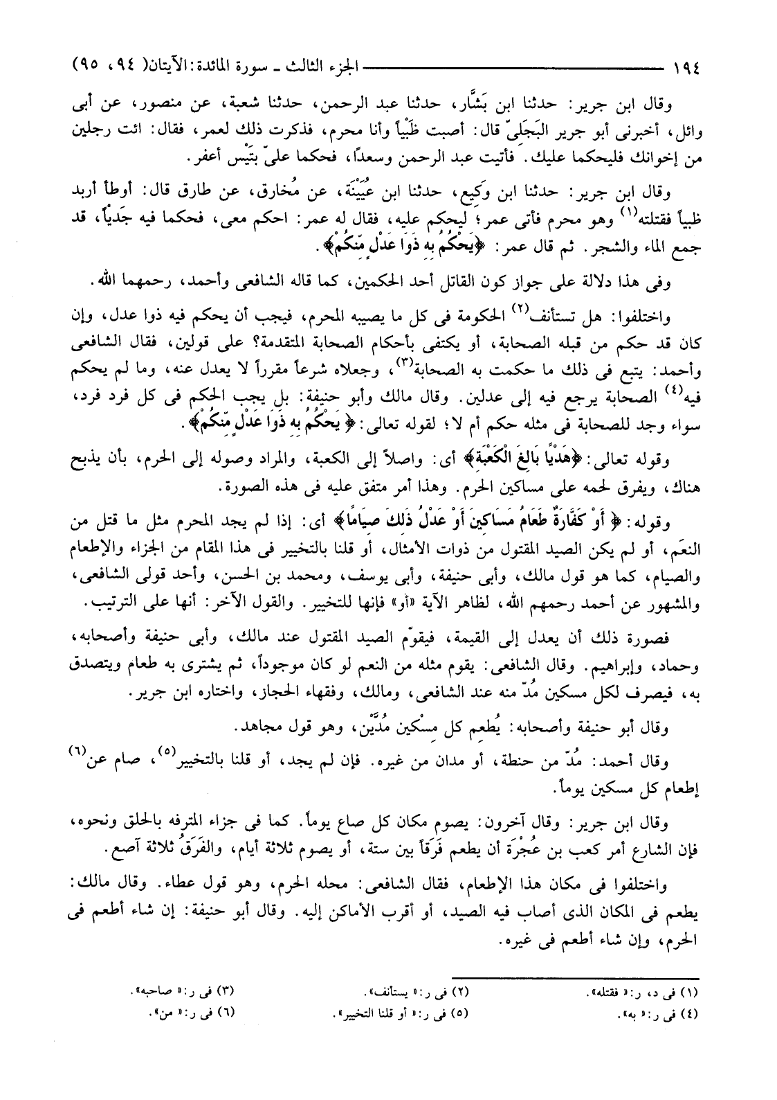 وَاخْتَلَفُوا: هَلْ تُسْتَأْنَفُ (2) الْحُكُومَةُ فِي كُلِّ مَا يُصِيبُهُ الْمُحْرِمُ، فَيَجِبُ أَنْ يَحْكُمَ فِيهِ ذَوَا عَدْلٍ، وَإِنْ كَانَ قَدْ حَكَمَ مِنْ قَبْلِهِ الصَّحَابَةُ، أَوْ يَكْتَفِي بِأَحْكَامِ الصَّحَابَةِ الْمُتَقَدِّمَةِ؟ عَلَى قَوْلَيْنِ، فَقَالَ الشَّافِعِيُّ وَأَحْمَدُ: يُتْبَعُ فِي ذَلِكَ مَا حَكَمَتْ بِهِ الصَّحَابَةُ (3) وَجَعَلَاهُ شَرْعًا مُقَرَّرًا لَا يُعْدَلُ عَنْهُ، وَمَا لَمْ يَحْكُمْ فِيهِ (4) الصَّحَابَةُ يُرْجَعُ فِيهِ إِلَى عَدْلَيْنِ. وَقَالَ مَالِكٌ وَأَبُو حَنِيفَةَ: بَلْ يَجِبُ الْحُكْمُ فِي كُلِّ فَرْدٍ فَرَدٍ، سَوَاءٌ وُجِدَ لِلصَّحَابَةِ فِي مِثْلِهِ حُكْمٌ أَمْ لَا؛ لِقَوْلِهِ تَعَالَى: {يَحْكُمُ بِهِ ذَوَا عَدْلٍ مِنْكُمْ}