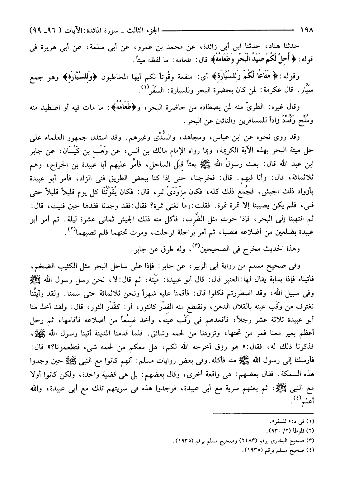 وَقَدْ رُوِيَ نَحْوُهُ عَنِ ابْنِ عَبَّاسٍ، وَمُجَاهِدٍ، والسُّدِّي وَغَيْرِهِمْ. وَقَدِ اسْتَدَلَّ جُمْهُورُ الْعُلَمَاءِ عَلَى حِلِّ مَيْتَةِ الْبَحْرِ بِهَذِهِ الْآيَةِ الْكَرِيمَةِ، وَبِمَا رَوَاهُ الْإِمَامُ مَالِكُ بْنُ أَنَسٍ، عَنْ وَهْبِ بْنِ كَيْسَان، عَنْ جَابِرِ بْنِ عَبْدِ اللَّهِ قَالَ: بَعَثَ رسولُ اللَّهِ صَلَّى اللَّهُ عَلَيْهِ وَسَلَّمَ بَعْثًا قِبَل السَّاحِلِ، فأمَّر عَلَيْهِمْ أَبَا عُبَيْدَةَ بْنَ الْجَرَّاحِ، وَهُمْ ثَلَاثُمِائَةٍ، قَالَ: وَأَنَا فِيهِمْ. قَالَ: فَخَرَجْنَا، حَتَّى إِذَا كُنَّا بِبَعْضِ الطَّرِيقِ فَنِيَ الزَّادُ، فَأَمَرَ أَبُو عُبَيْدَةَ بِأَزْوَادِ ذَلِكَ الْجَيْشِ، فجُمع ذَلِكَ كُلُّهُ، فَكَانَ مَزْوَدَيْ تَمْرٍ، قَالَ: فَكَانَ يُقَوِّتُنَا كُلَّ يَوْمٍ قَلِيلًا قَلِيلًا حَتَّى فَنِيَ، فَلَمْ يَكُنْ يُصِيبُنَا إِلَّا تَمْرَةً تَمْرَةً. فَقُلْتُ: وَمَا تُغْنِي تَمْرَةٌ؟ فَقَالَ: فَقَدْ وَجَدْنَا فَقْدَهَا حِينَ فَنِيَتْ، قَالَ: ثُمَّ انْتَهَيْنَا إِلَى الْبَحْرِ، فَإِذَا حُوتٌ مِثْلُ الظَّرِب، فَأَكَلَ مِنْهُ ذَلِكَ الْجَيْشُ ثَمَانِيَ عَشْرَةَ لَيْلَةً. ثُمَّ أَمَرَ أَبُو عُبَيْدَةَ بِضِلْعَيْنِ مِنْ أَضْلَاعِهِ فَنُصِبَا، ثُمَّ أَمَرَ بِرَاحِلَةٍ فَرُحِلَتْ، وَمَرَّتْ تَحْتَهُمَا فَلَمْ تُصِبْهُمَا. (2)