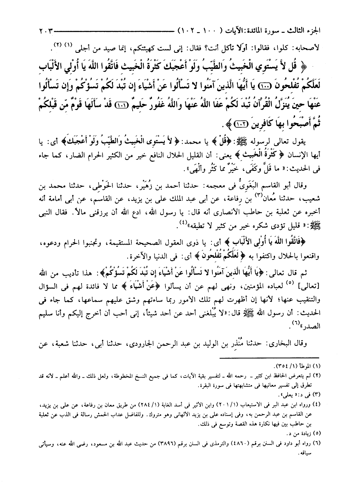 {قُلْ لَا يَسْتَوِي الْخَبِيثُ وَالطَّيِّبُ وَلَوْ أَعْجَبَكَ كَثْرَةُ الْخَبِيثِ فَاتَّقُوا اللَّهَ يَا أُولِي الألْبَابِ لَعَلَّكُمْ تُفْلِحُونَ (100) يَا أَيُّهَا الَّذِينَ آمَنُوا لَا تَسْأَلُوا عَنْ أَشْيَاءَ إِنْ تُبْدَ لَكُمْ تَسُؤْكُمْ وَإِنْ تَسْأَلُوا عَنْهَا حِينَ يُنزلُ الْقُرْآنُ تُبْدَ لَكُمْ عَفَا اللَّهُ عَنْهَا وَاللَّهُ غَفُورٌ حَلِيمٌ (101) قَدْ سَأَلَهَا قَوْمٌ مِنْ قَبْلِكُمْ ثُمَّ أَصْبَحُوا بِهَا كَافِرِينَ (102) }