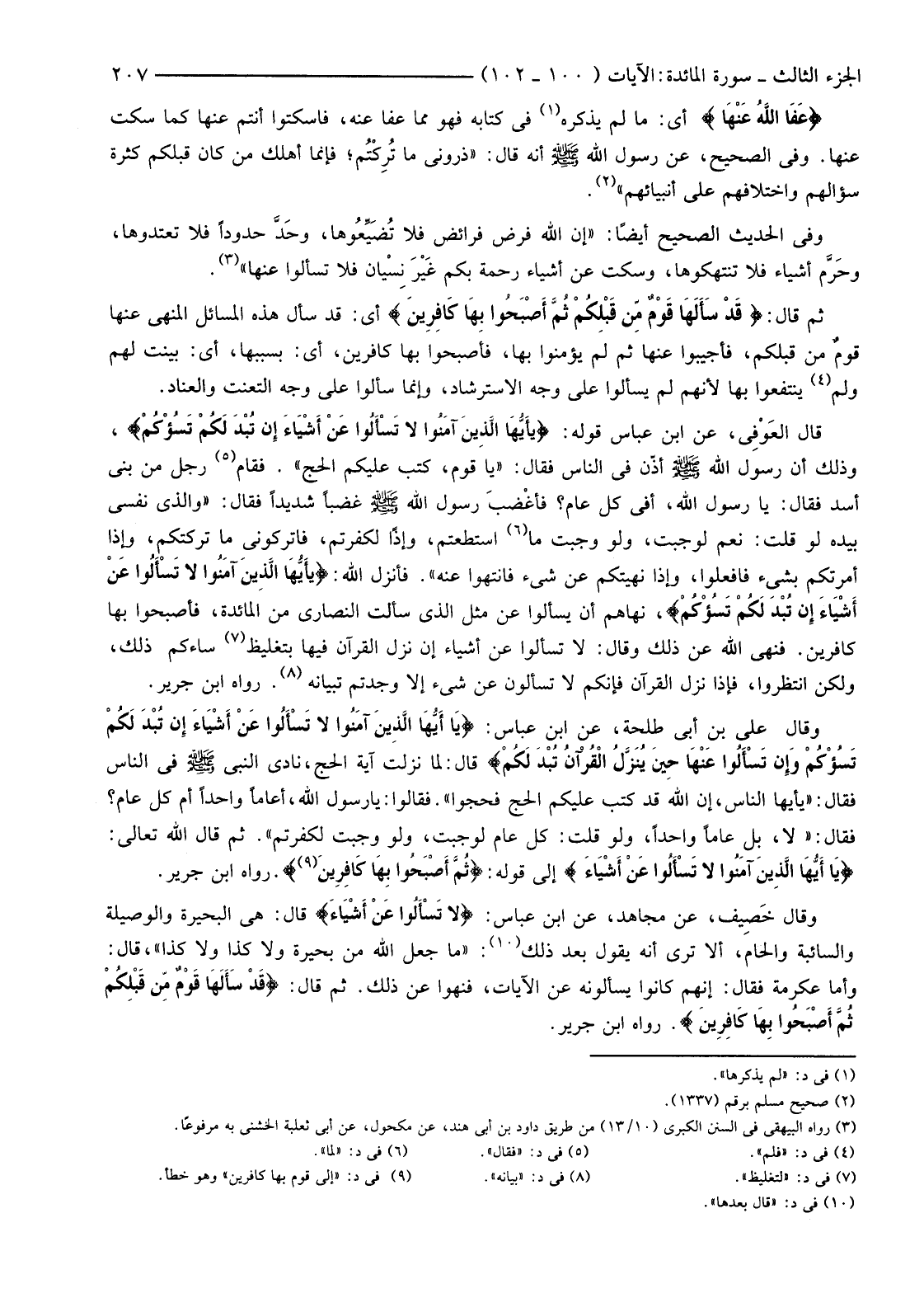 قَالَ، العَوْفِي، عَنِ ابْنِ عَبَّاسٍ قَوْلُهُ: {يَا أَيُّهَا الَّذِينَ آمَنُوا لَا تَسْأَلُوا عَنْ أَشْيَاءَ إِنْ تُبْدَ لَكُمْ تَسُؤْكُمْ} وَذَلِكَ أَنَّ رَسُولَ اللَّهِ صَلَّى اللَّهُ عَلَيْهِ وسلم أَذَّنَ فِي النَّاسِ فَقَالَ: "يَا قَوْمِ كُتِبَ عَلَيْكُمُ الْحَجُّ". فَقَامَ (5) رَجُلٌ مِنْ بَنِي أَسَدٍ فَقَالَ: يَا رَسُولَ اللَّهِ، أَفِي كُلِّ عَامٍ؟ فأغْضبَ رَسُولُ اللَّهِ صَلَّى اللَّهُ عَلَيْهِ وَسَلَّمَ غَضَبًا شَدِيدًا فَقَالَ: "وَالَّذِي نَفْسِي بِيَدِهِ لَوْ قُلْتُ: نَعَمْ لَوَجَبَتْ، وَلَوْ وَجَبَتْ مَا (6) اسْتَطَعْتُمْ، وإذًا لَكَفَرْتُمْ، فَاتْرُكُونِي مَا تَرَكْتُكُمْ، وَإِذَا أَمَرْتُكُمْ بِشَيْءٍ فَافْعَلُوا، وَإِذَا نَهَيْتُكُمْ عَنْ شَيْءٍ فَانْتَهُوا عَنْهُ". فَأَنْزَلَ اللَّهُ: {يَا أَيُّهَا الَّذِينَ آمَنُوا لَا تَسْأَلُوا عَنْ أَشْيَاءَ إِنْ تُبْدَ لَكُمْ تَسُؤْكُمْ} نَهَاهُمْ أَنْ يَسْأَلُوا عَنْ مِثْلِ الَّذِي سَأَلَتِ النَّصَارَى مِنَ الْمَائِدَةِ، فَأَصْبَحُوا بِهَا كَافِرِينَ. فَنَهَى اللَّهُ عَنْ ذَلِكَ وَقَالَ: لَا تَسْأَلُوا عَنْ أَشْيَاءَ إِنْ نَزَلَ الْقُرْآنُ فِيهَا بِتَغْلِيظٍ (7) سَاءَكُمْ ذَلِكَ، وَلَكِنِ انْتَظَرُوا، فَإِذَا نَزَلَ الْقُرْآنُ فَإِنَّكُمْ لَا تَسْأَلُونَ عَنْ شَيْءٍ إِلَّا وَجَدْتُمْ تِبْيَانَهُ (8) رَوَاهُ ابْنُ جَرِيرٍ.