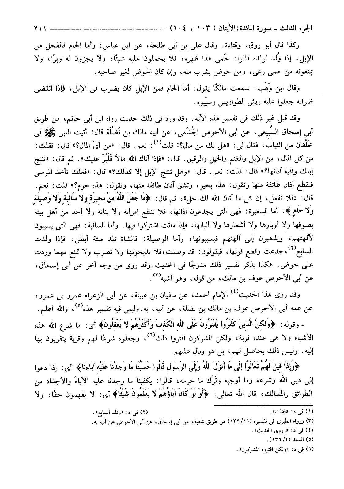 وَقَدْ قِيلَ غَيْرُ ذَلِكَ فِي تَفْسِيرِ هَذِهِ الْآيَةِ. وَقَدْ وَرَدَ فِي ذَلِكَ حَدِيثٌ رَوَاهُ ابْنُ أَبِي حَاتِمٍ، مِنْ طَرِيقِ أَبِي إِسْحَاقَ السَّبِيعي، عَنْ أَبِي الْأَحْوَصِ الجُشَمي، عَنْ أَبِيهِ مَالِكِ بْنِ نَضْلَة قَالَ: أَتَيْتُ النَّبِيَّ صَلَّى اللَّهُ عَلَيْهِ وَسَلَّمَ فِي خَلْقان مِنَ الثِّيَابِ، فَقَالَ لِي: "هَلْ لَكَ مِنْ مَالٍ؟ " قُلْتُ (1) نَعَمْ. قَالَ: "مِنْ أَيِّ الْمَالِ؟ " قَالَ: فَقُلْتُ: مِنْ كُلِّ الْمَالِ، مِنَ الْإِبِلِ وَالْغَنَمِ وَالْخَيْلِ وَالرَّقِيقِ. قَالَ: "فَإِذَا آتَاكَ اللَّهُ مَالًا فلْيُرَ عَلَيْكَ". ثُمَّ قَالَ: "تُنْتِجُ إِبِلُكَ وَافِيَةً آذَانُهَا؟ " قَالَ: قُلْتُ: نَعَمْ. قَالَ: "وَهَلْ تُنْتِجُ الْإِبِلُ إِلَّا كَذَلِكَ؟ " قَالَ: "فَلَعَلَّكَ تَأْخُذُ الْمُوسَى فَتَقْطَعُ آذَانَ طَائِفَةٍ مِنْهَا وَتَقُولُ: هَذِهِ بَحِيرٌ، وَتَشُقُّ آذَانَ طَائِفَةٍ مِنْهَا، وَتَقُولُ: هَذِهِ حَرَمٌ؟ " قُلْتُ: نَعَمْ. قَالَ: "فَلَا تَفْعَلْ، إِنَّ كُلَّ مَا آتَاكَ اللَّهُ لَكَ حِلٌّ"، ثُمَّ قَالَ: {مَا جَعَلَ اللَّهُ مِنْ بَحِيرَةٍ وَلا سَائِبَةٍ وَلا وَصِيلَةٍ وَلا حَامٍ} أَمَّا الْبَحِيرَةُ: فَهِيَ الَّتِي يَجْدَعُونَ آذَانَهَا، فَلَا تَنْتَفِعُ امْرَأَتُهُ وَلَا بَنَاتُهُ وَلَا أَحَدٌ مِنْ أَهْلِ بَيْتِهِ بِصُوفِهَا وَلَا أَوْبَارِهَا وَلَا أَشْعَارِهَا وَلَا أَلْبَانِهَا، فَإِذَا مَاتَتِ اشْتَرَكُوا فِيهَا. وَأَمَّا السَّائِبَةُ: فَهِيَ الَّتِي يُسَيِّبُونَ لِآلِهَتِهِمْ، وَيَذْهَبُونَ إِلَى آلِهَتِهِمْ فَيُسَيِّبُونَهَا، وَأَمَّا الْوَصِيلَةُ: فَالشَّاةُ تَلِدُ سِتَّةَ أَبْطُنٍ، فَإِذَا وَلَدَتِ السَّابِعَ (2) جُدِعَتْ وَقُطِعَ قَرْنُهَا، فَيَقُولُونَ: قَدْ وَصَلَتْ، فَلَا يَذْبَحُونَهَا وَلَا تُضْرَبُ وَلَا تُمْنَعُ مَهْمَا وَرَدَتْ عَلَى حَوْضٍ. هَكَذَا يَذْكُرُ تَفْسِيرَ ذَلِكَ مُدْرَجًا فِي الْحَدِيثِ. وَقَدْ رُوِيَ مِنْ وَجْهٍ آخَرَ عَنْ أَبِي إِسْحَاقَ، عَنْ أَبِي الْأَحْوَصِ عَوْفِ بْنِ مَالِكٍ، مِنْ قَوْلِهِ، وَهُوَ أَشْبَهُ. (3)