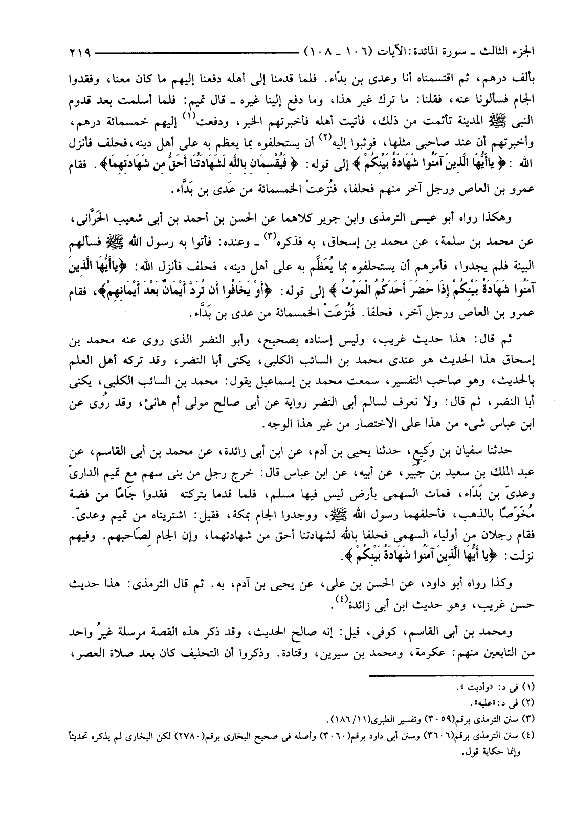 وَهَكَذَا رَوَاهُ أَبُو عِيسَى التِّرْمِذِيُّ وَابْنُ جَرِيرٍ كِلَاهُمَا عَنِ الْحَسَنِ بْنِ أَحْمَدَ بْنِ أبي شعيب الحَرَّاني، عن محمد بن سلمة، عَنْ مُحَمَّدِ بْنِ إِسْحَاقَ، بِهِ فَذَكَرَهُ (3) -وَعِنْدَهُ: فَأَتَوْا بِهِ رَسُولَ اللَّهِ صَلَّى اللَّهُ عَلَيْهِ وَسَلَّمَ فَسَأَلَهُمُ الْبَيِّنَةَ فَلَمْ يَجِدُوا، فَأَمَرَهُمْ أَنْ يَسْتَحْلِفُوهُ بِمَا يُعَظَّم بِهِ عَلَى أَهْلِ دِينِهِ، فَحَلَفَ فَأَنْزَلَ اللَّهُ: {يَا أَيُّهَا الَّذِينَ آمَنُوا شَهَادَةُ بَيْنِكُمْ إِذَا حَضَرَ أَحَدَكُمُ الْمَوْتُ} إِلَى قَوْلِهِ: {أَوْ يَخَافُوا أَنْ تُرَدَّ أَيْمَانٌ بَعْدَ أَيْمَانِهِمْ} فَقَامَ عَمْرُو بْنُ الْعَاصِ وَرَجُلٌ آخَرُ، فَحَلَفَا. فَنزعَتْ الْخَمْسُمِائَةٍ مِنْ عَدِيِّ بْنِ بَدَّاء.