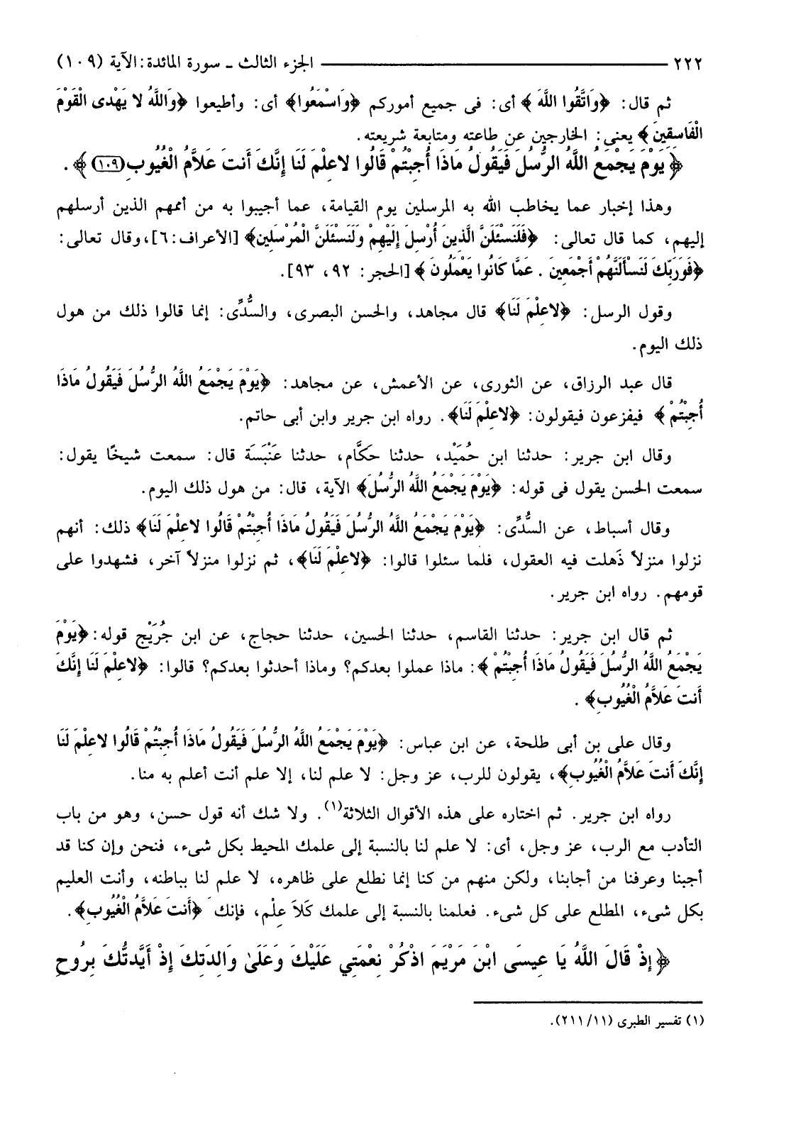 ثُمَّ قَالَ ابْنُ جَرِيرٍ: حَدَّثَنَا الْقَاسِمُ، حَدَّثَنَا الْحُسَيْنُ، حَدَّثَنَا الْحَجَّاجُ، عَنِ ابْنِ جُرَيْج قَوْلُهُ: {يَوْمَ يَجْمَعُ اللَّهُ الرُّسُلَ فَيَقُولُ مَاذَا أُجِبْتُمْ} مَاذَا عَمِلُوا بَعْدَكُمْ؟ وَمَاذَا أَحْدَثُوا بَعْدَكُمْ؟ قَالُوا: {لَا عِلْمَ لَنَا إِنَّكَ أَنْتَ عَلامُ الْغُيُوبِ}