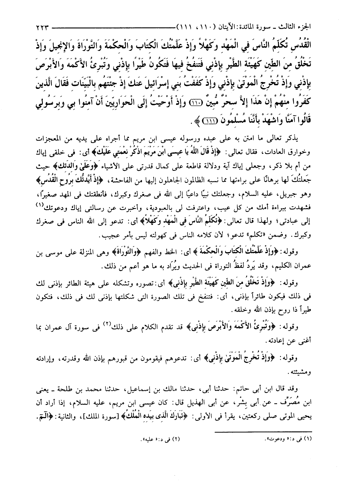 {إِذْ قَالَ اللَّهُ يَا عِيسَى ابْنَ مَرْيَمَ اذْكُرْ نِعْمَتِي عَلَيْكَ وَعَلى وَالِدَتِكَ إِذْ أَيَّدْتُكَ بِرُوحِ الْقُدُسِ تُكَلِّمُ النَّاسَ فِي الْمَهْدِ وَكَهْلا وَإِذْ عَلَّمْتُكَ الْكِتَابَ وَالْحِكْمَةَ وَالتَّوْرَاةَ وَالإنْجِيلَ وَإِذْ تَخْلُقُ مِنَ الطِّينِ كَهَيْئَةِ الطَّيْرِ بِإِذْنِي فَتَنْفُخُ فِيهَا فَتَكُونُ طَيْرًا بِإِذْنِي وَتُبْرِئُ الأكْمَهَ وَالأبْرَصَ بِإِذْنِي وَإِذْ تُخْرِجُ الْمَوْتَى بِإِذْنِي وَإِذْ كَفَفْتُ بَنِي إِسْرَائِيلَ عَنْكَ إِذْ جِئْتَهُمْ بِالْبَيِّنَاتِ فَقَالَ الَّذِينَ كَفَرُوا مِنْهُمْ إِنْ هَذَا إِلا سِحْرٌ مُبِينٌ (110) وَإِذْ أَوْحَيْتُ إِلَى الْحَوَارِيِّينَ أَنْ آمِنُوا بِي وَبِرَسُولِي قَالُوا آمَنَّا وَاشْهَدْ بِأَنَّنَا مُسْلِمُونَ (111) }